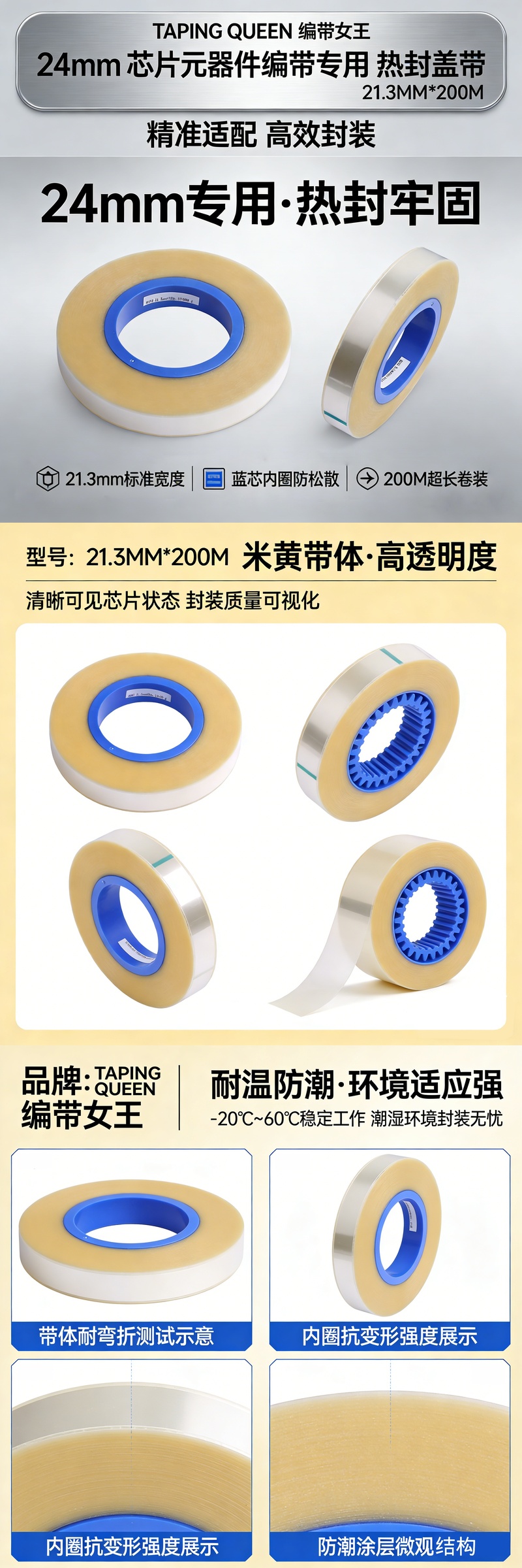 TAPING QUEEN 编带女王 21.3MM×200M 盖带 24mm 芯片元器件编带专用 热封盖带