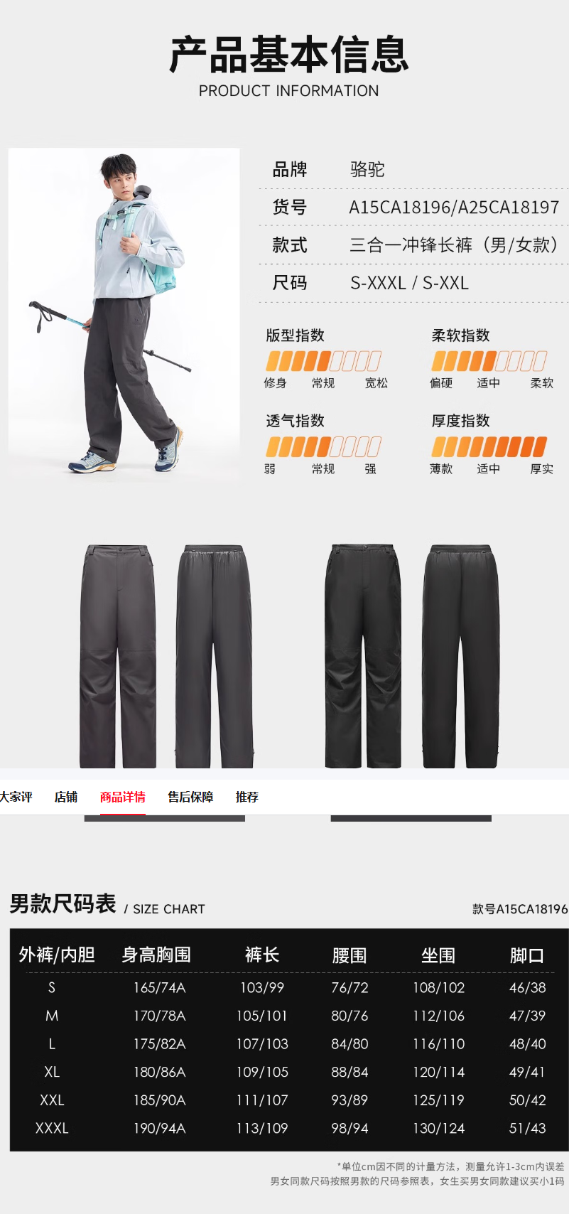 骆驼户外冲锋裤男三合一防风防水羽绒内胆高透湿防失温登山长裤8196