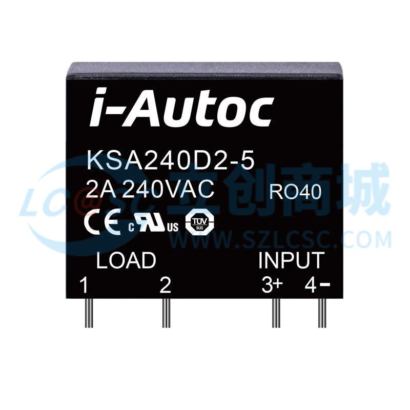 i-Autoc KSA240D2-5属于KSA系列单相交流输出小型固态继电器,具备耐高浪涌电流能力;输入为直流控制,输出为交流型(TRIAC输出);兼容TTL驱动,控制电流仅10mA,控制电压支持5VDC/12VDC/24VDC;负载电压可达240VAC,介质耐压3000Vrms;采用电路板安装方式,符合RoHS标准;通过UL(UL508标准)和TUV(EN62314标准)认证,质量可靠