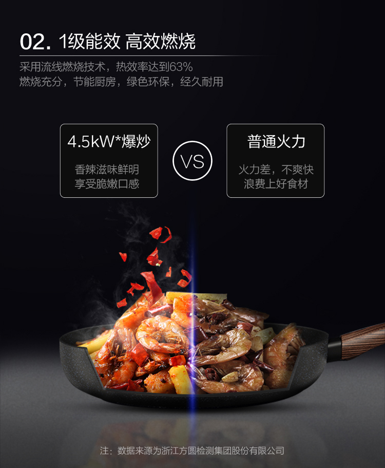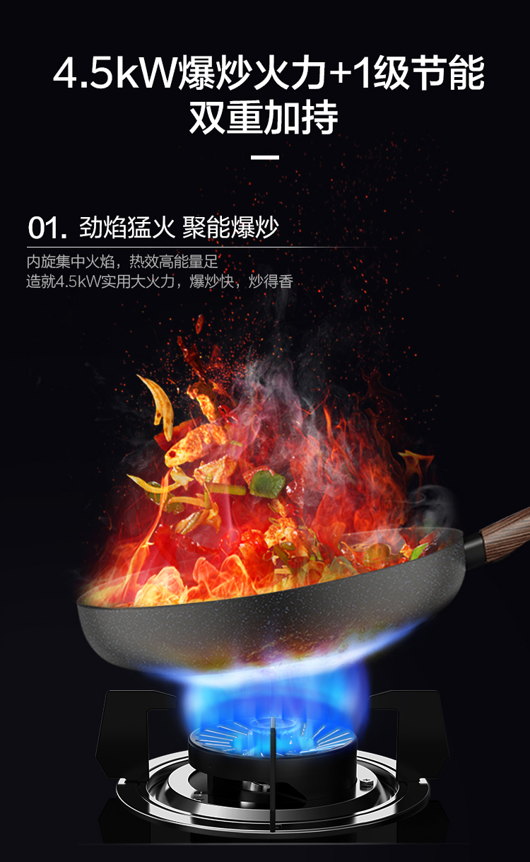 4.5kW劲焰猛火:内旋集中火焰,热效高能量足,满足爆炒需求,食材鲜嫩口感好