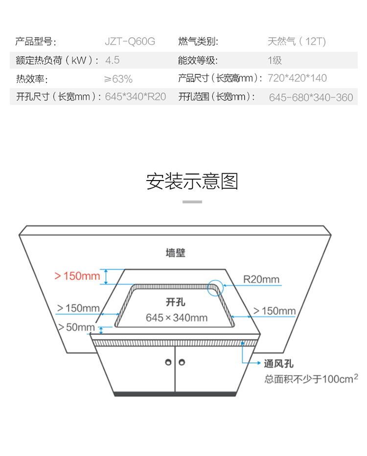 安装规范:需由专业人员安装,安装前确认燃气类别为天然气(12T);开孔尺寸需符合645*340*R20mm,开孔范围645-680*340-360mm;橱柜需预留通风孔(总面积≥100cm²),灶具与墙壁等距离≥150mm,底部距离≥50mm