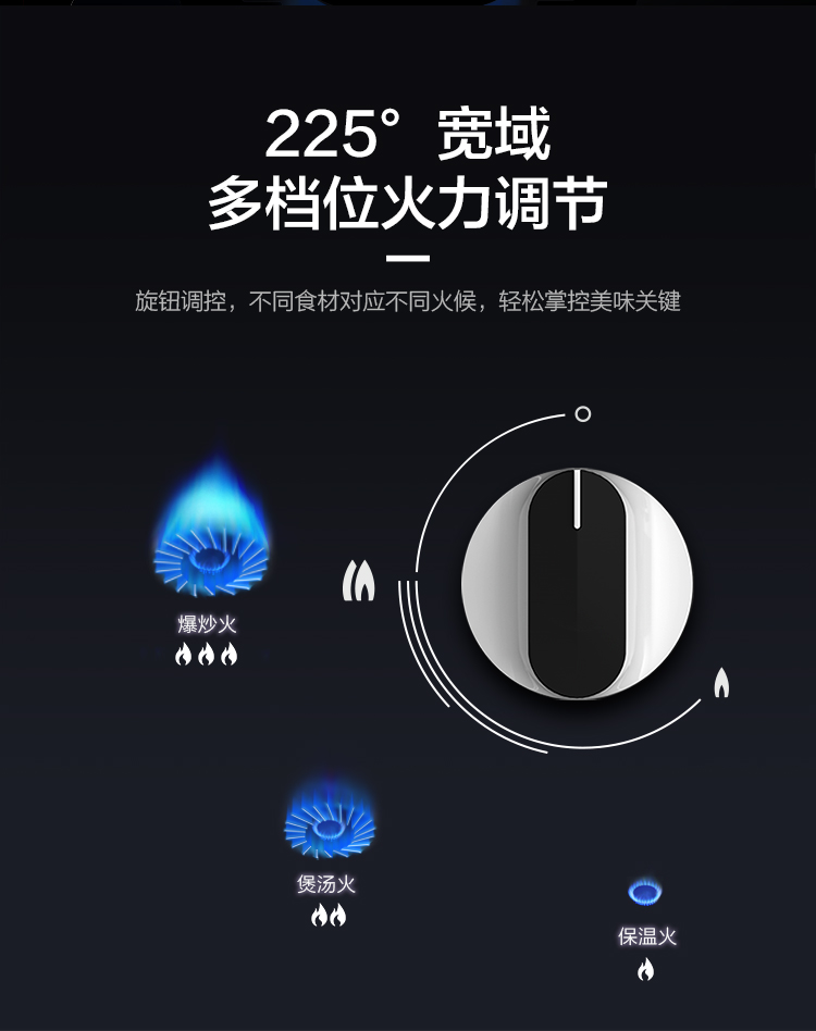 225°宽域火力调节:旋钮调控多档位,适配爆炒、煲汤、保温等不同烹饪场景