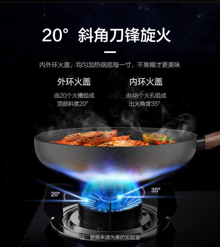 20°斜角刀锋旋火:外环火盖20个火槽(20°斜角)+内环火盖48个火孔(35°出火角),均匀加热锅底,避免焦糊