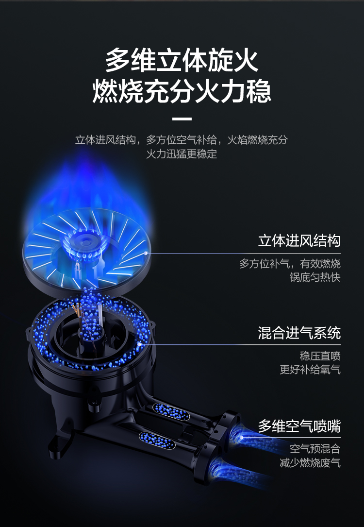 多维立体旋火:立体进风结构+混合进气系统,多方位空气补给,火焰燃烧充分且火力稳定