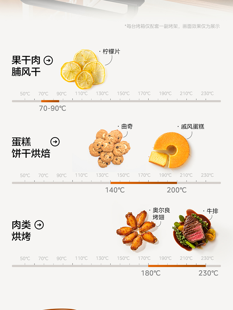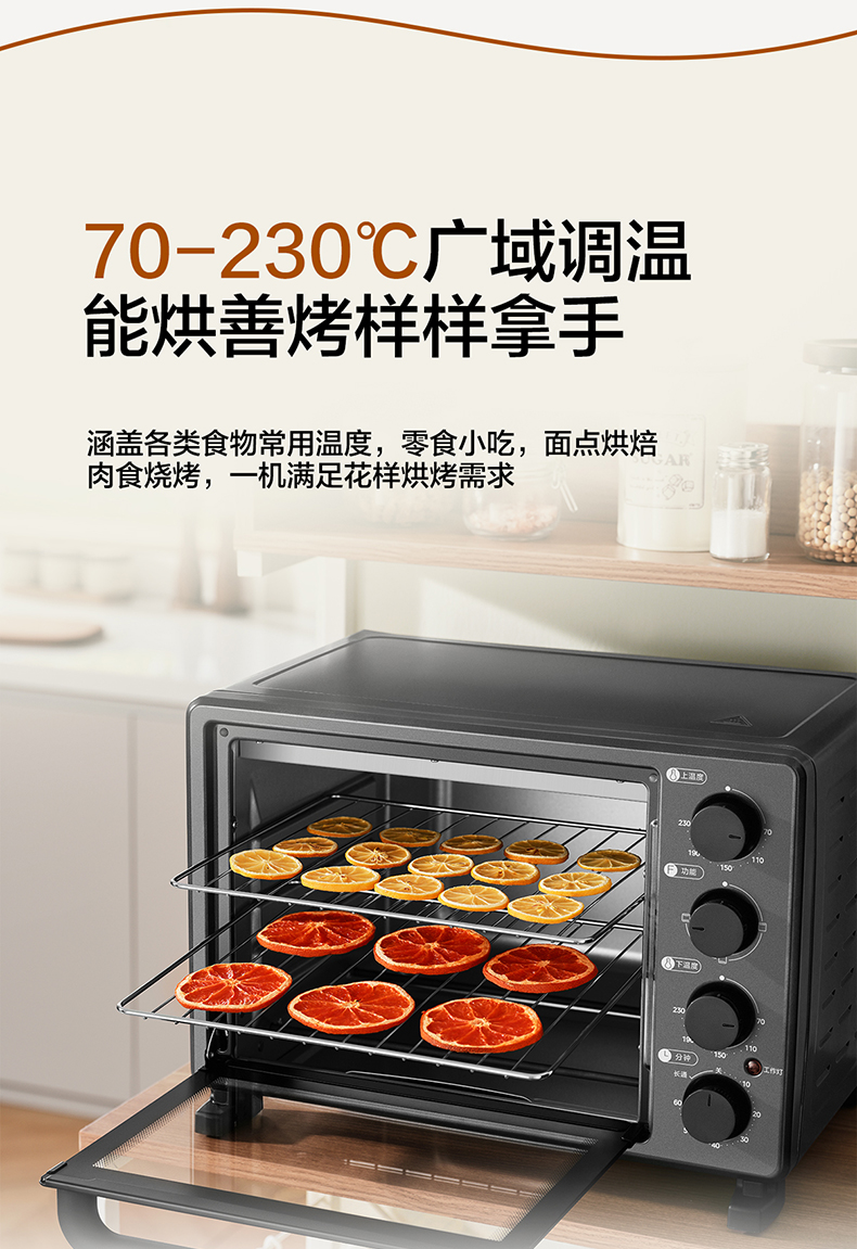 70-230℃广域调温:覆盖果干风干(70-90℃)、蛋糕饼干烘焙(140-200℃)、肉类烤制(180-230℃)等多种温度需求