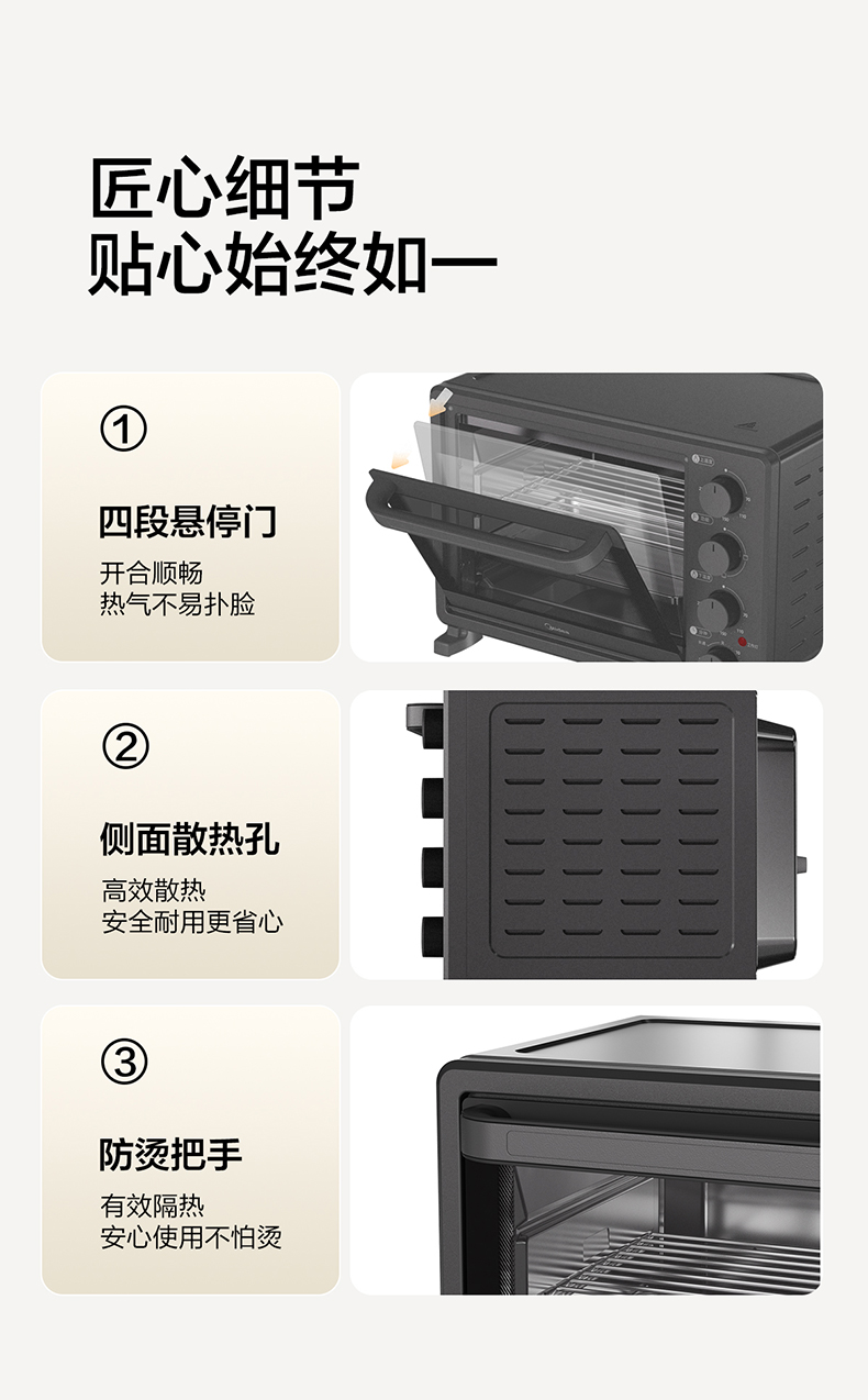 贴心细节:四段悬停门开合顺畅热气不易扑脸,侧面散热孔高效散热,防烫把手有效隔热
