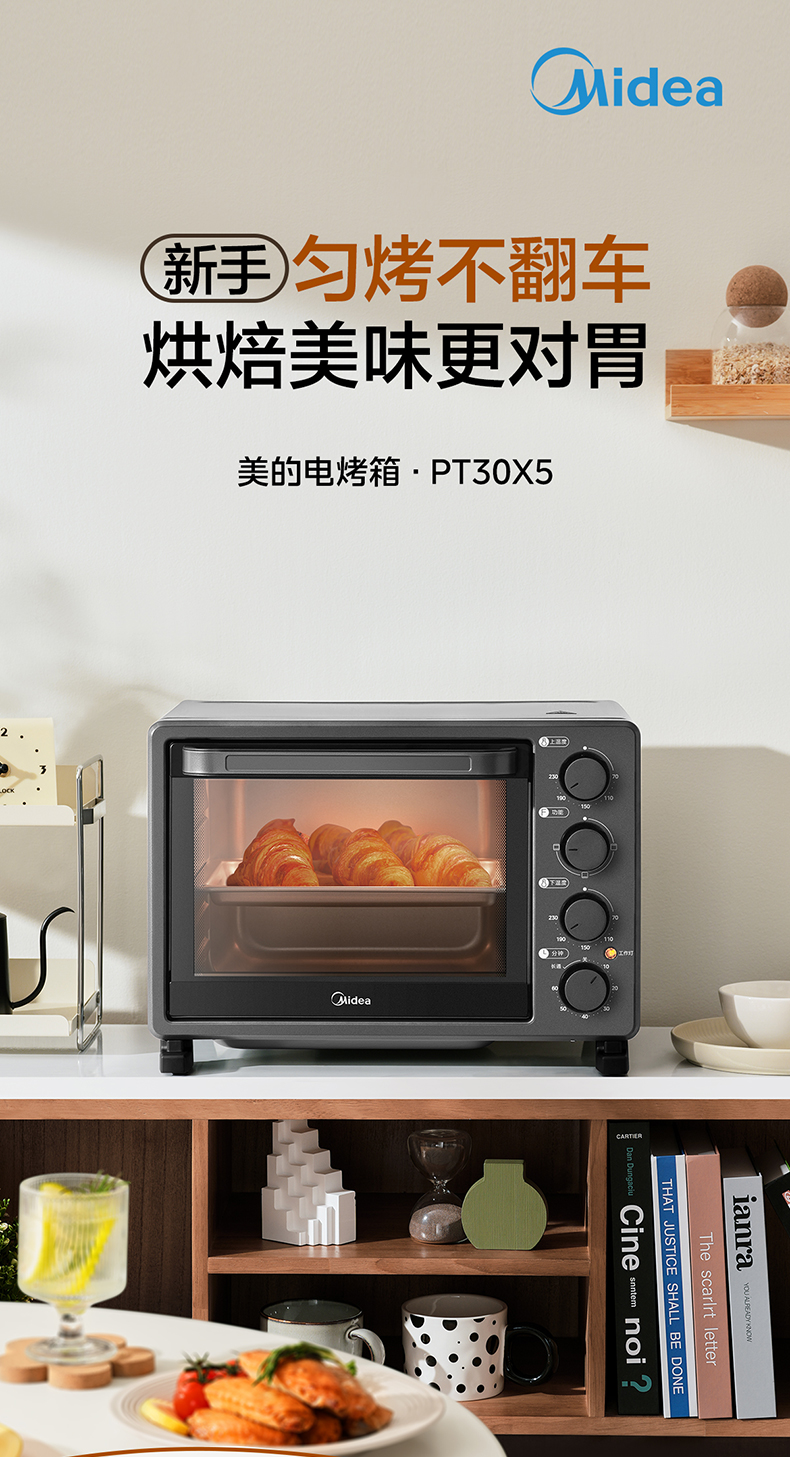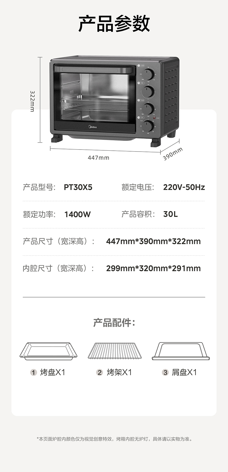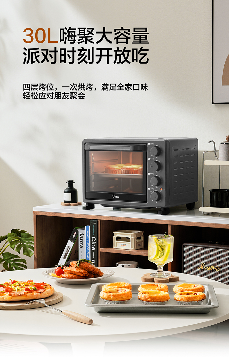 30L大容量:四层烤位,单层可烤10寸披萨1个、烤翅12个、蛋挞12个等,满足家庭及朋友聚会需求