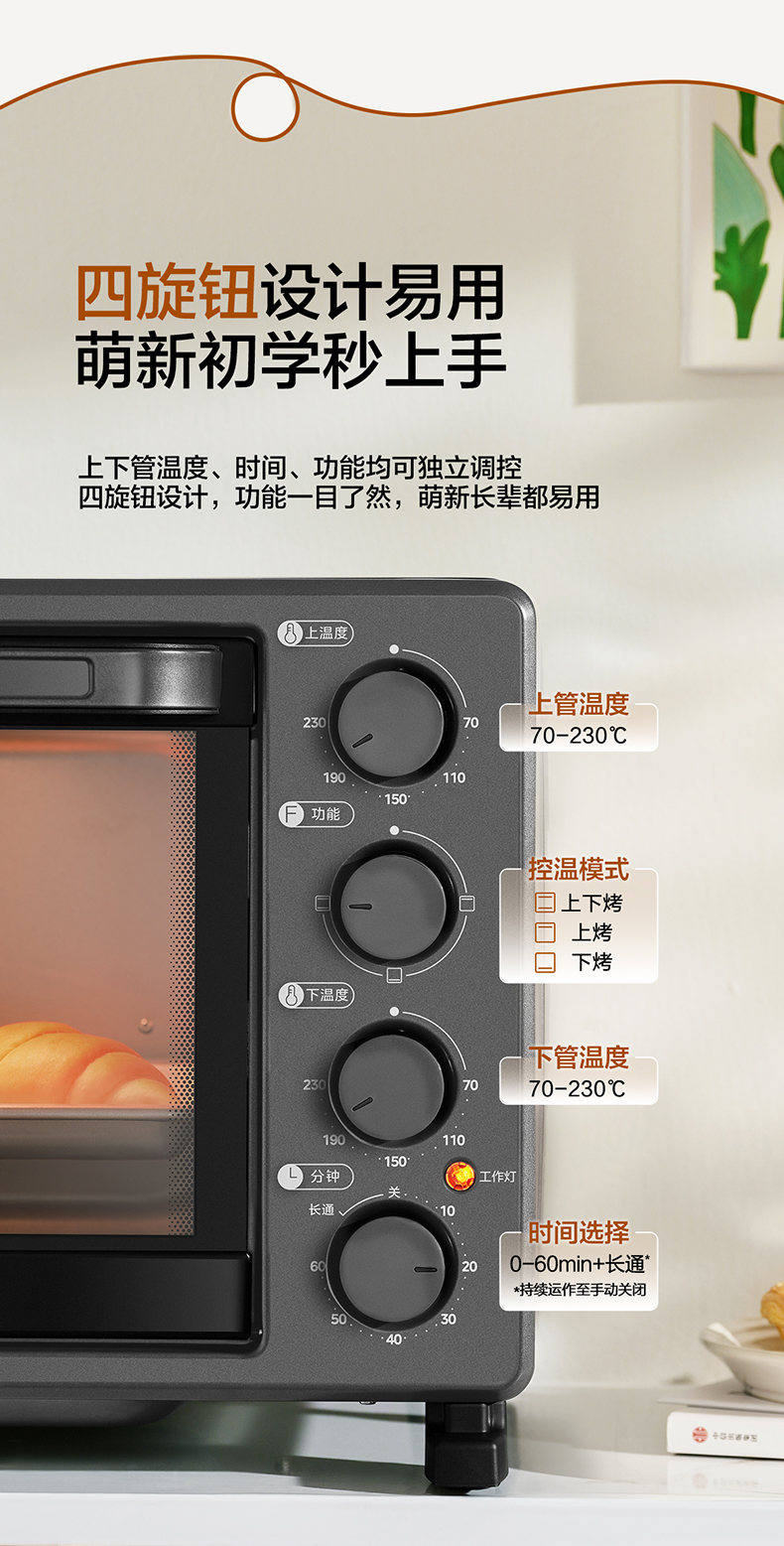 四旋钮设计:上下管温度、功能、时间独立调控,操作简单易上手
