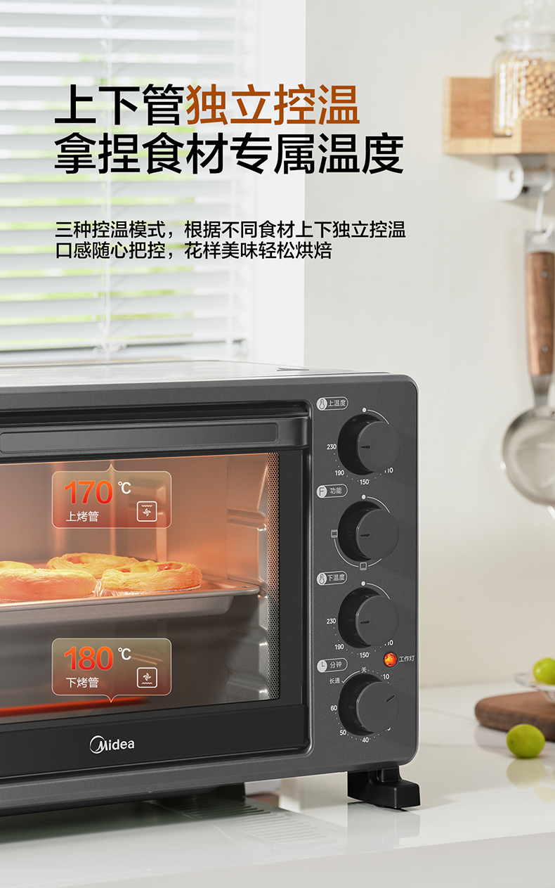 上下管独立控温:支持上烤、下烤、上下烤三种模式,可针对不同食材调整温度,如披萨上低下高、蛋挞上高下低、戚风蛋糕上下同温,满足多样烘焙需求