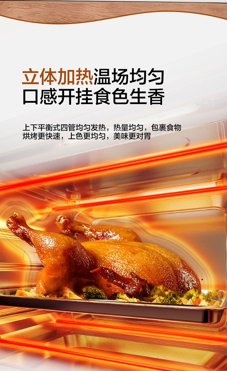 立体加热:上下平衡式四管均匀发热,温场均匀,食物上色更快更均匀