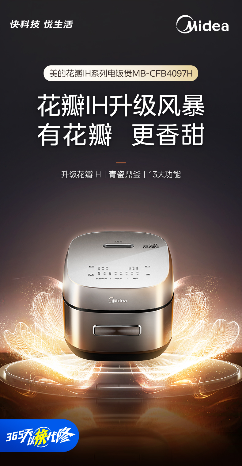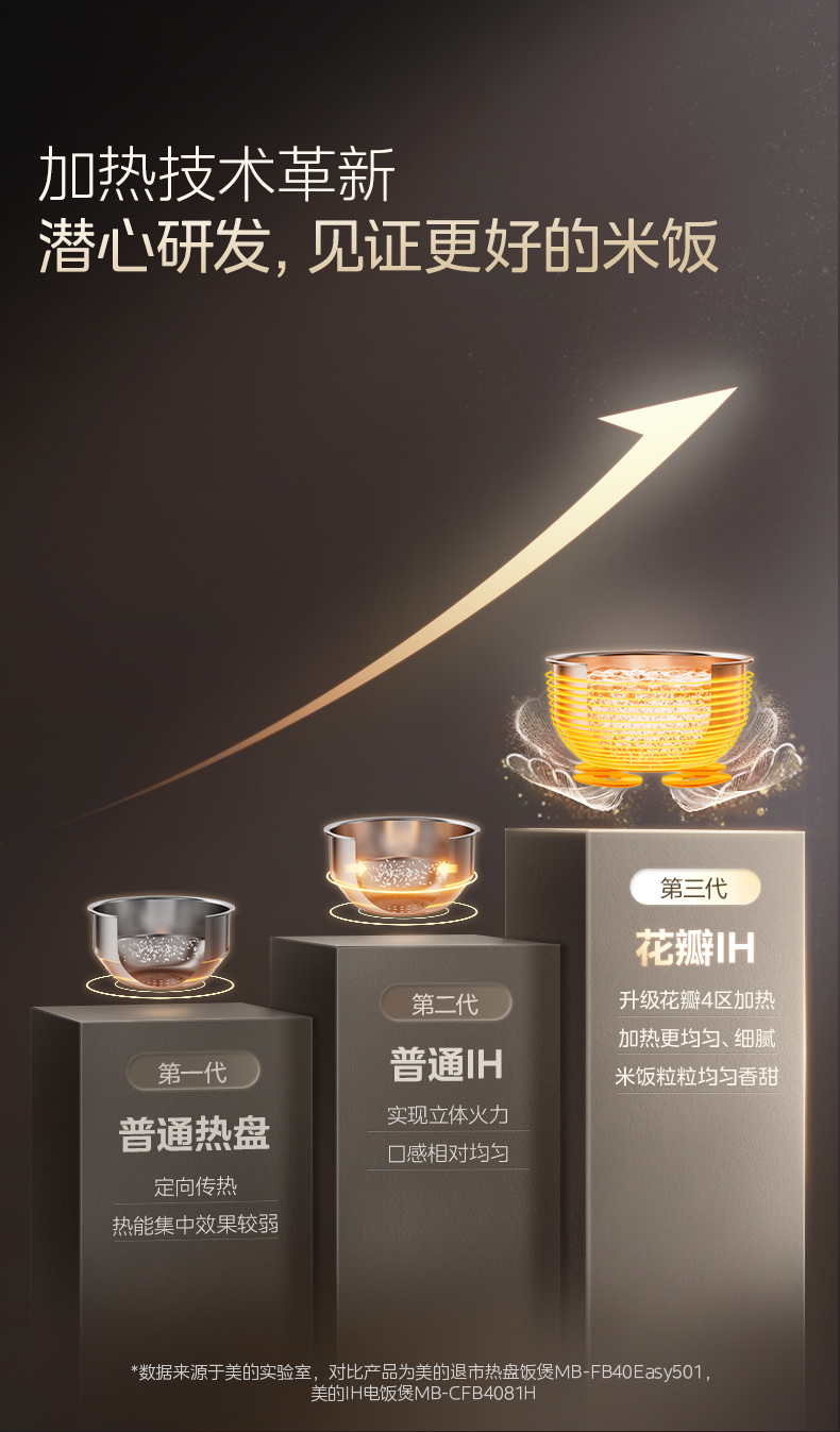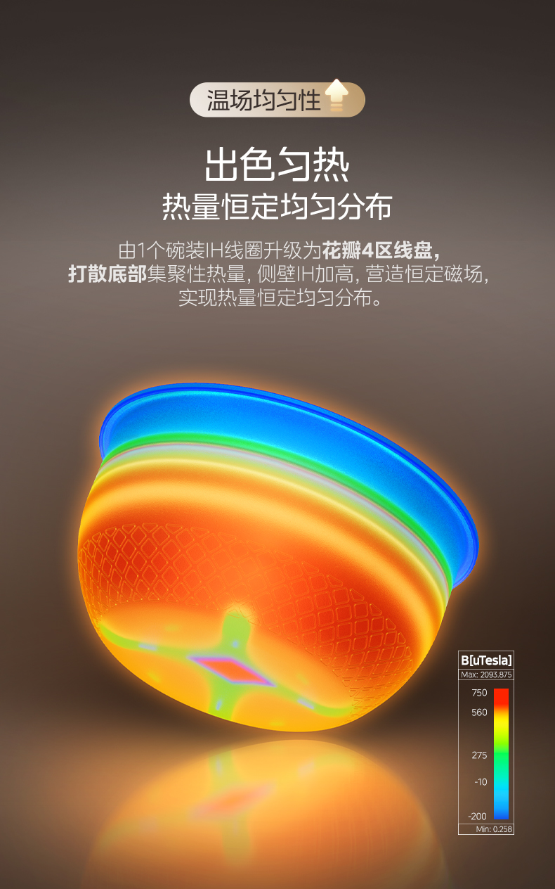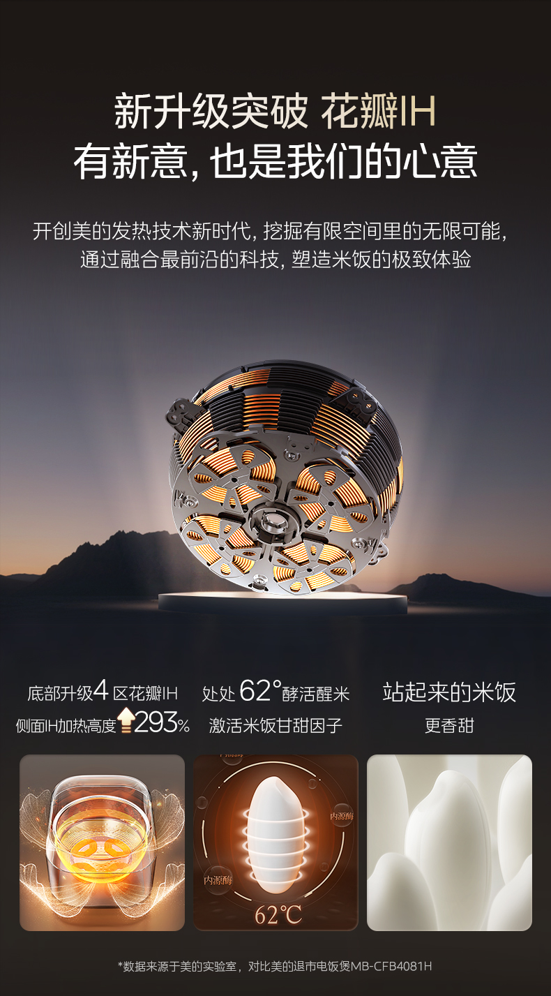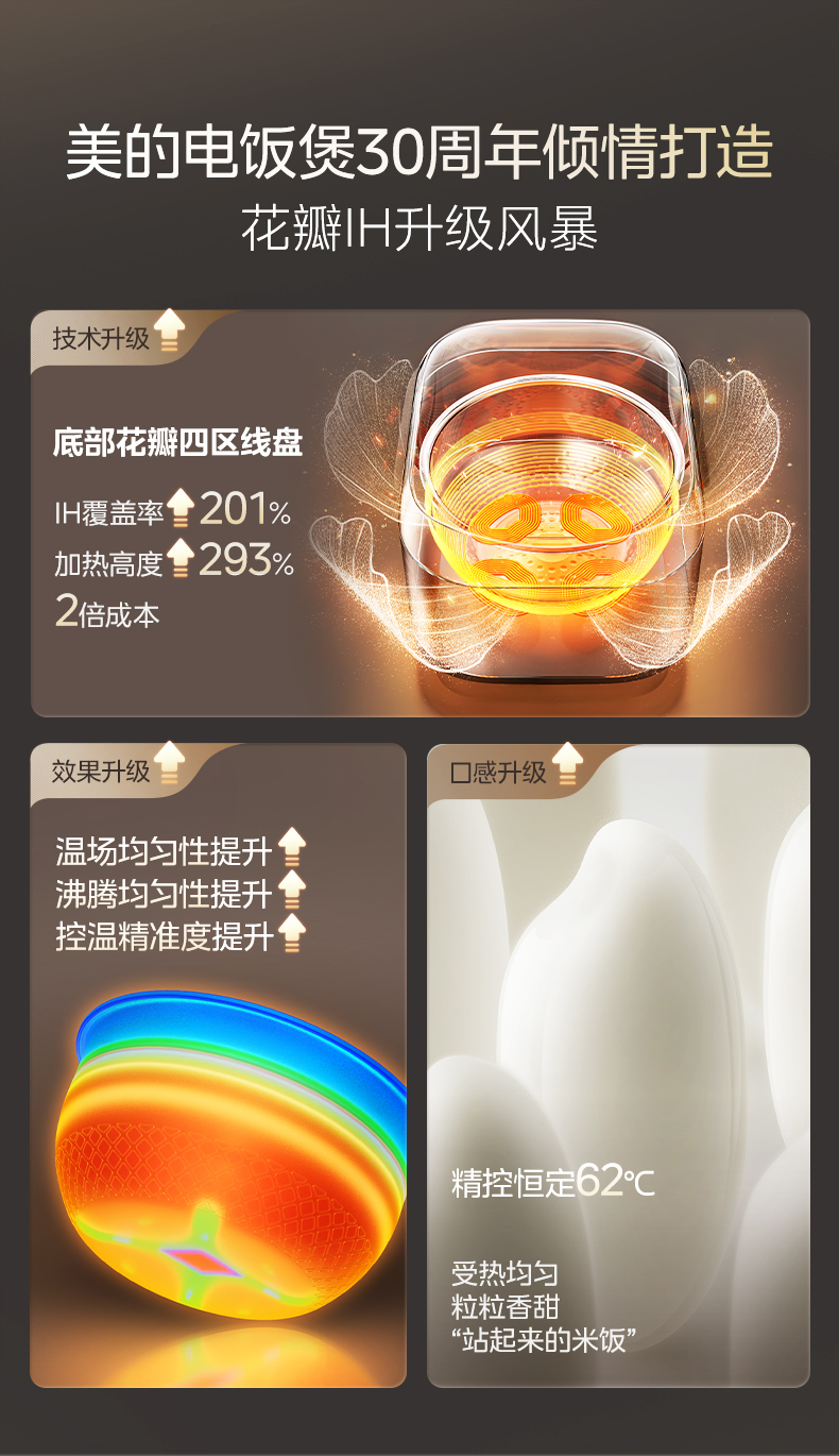 花瓣IH升级技术:底部四区线盘设计,IH覆盖率提升201%,加热高度提升293%,热量分布均匀,米饭受热一致