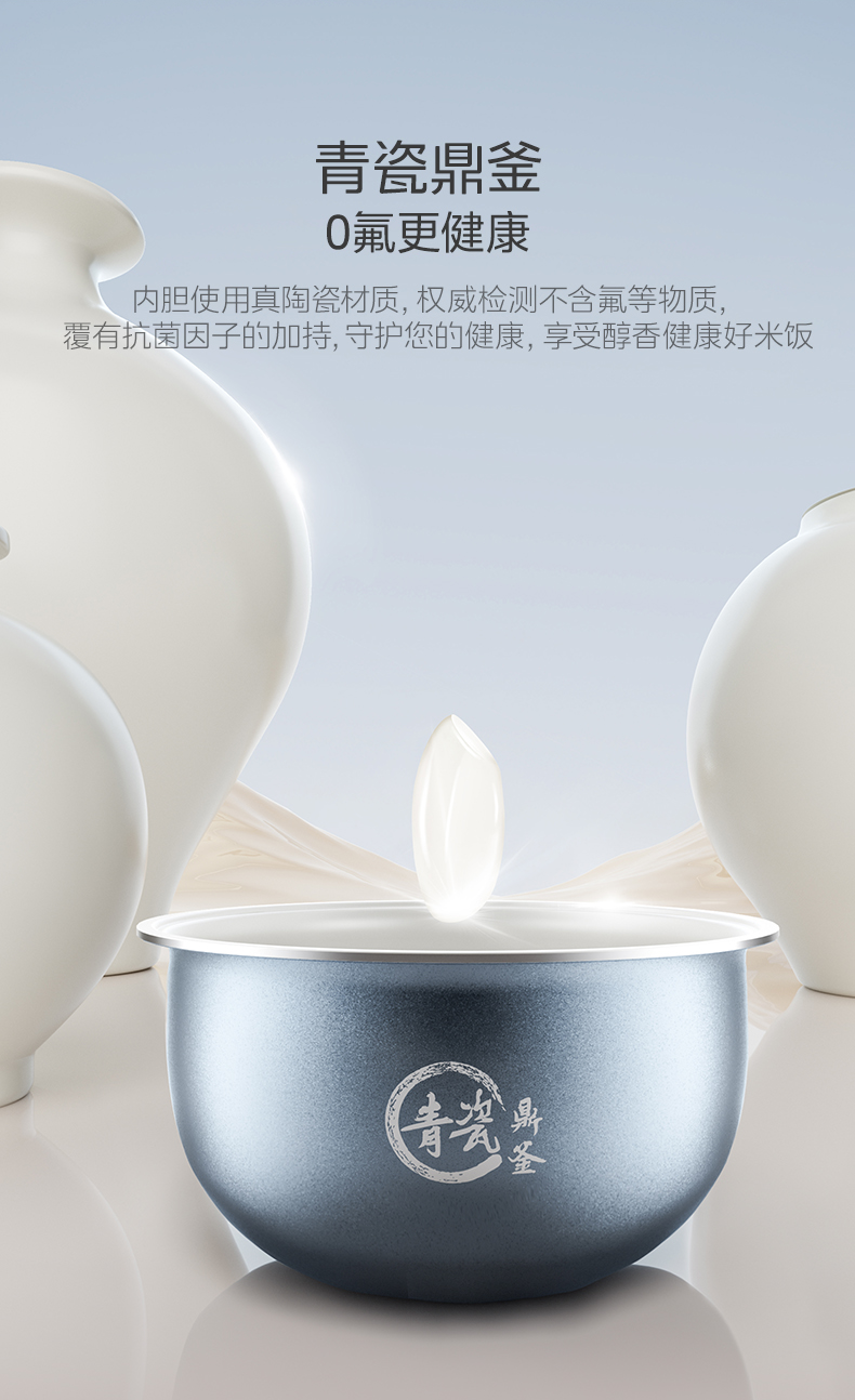 青瓷鼎釜内胆:真陶瓷材质,权威检测不含氟,覆抗菌因子,健康安全