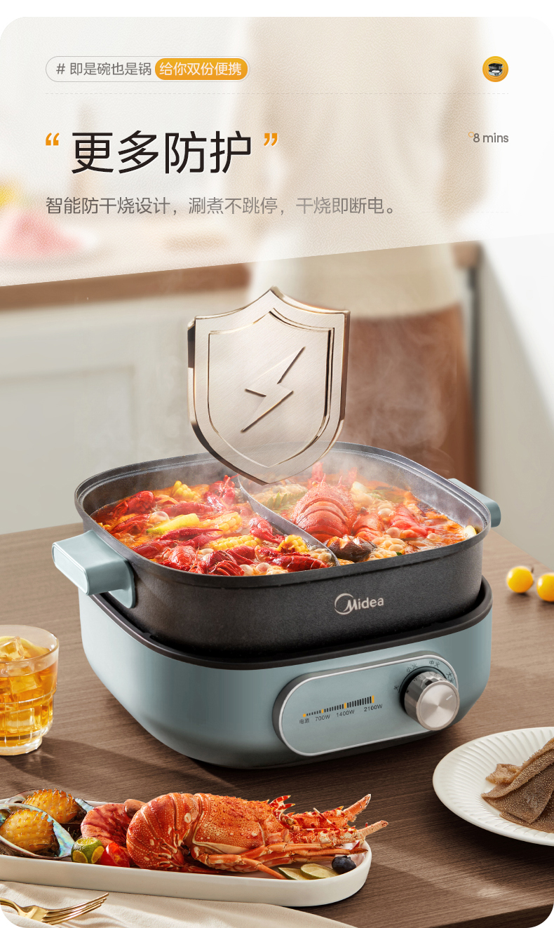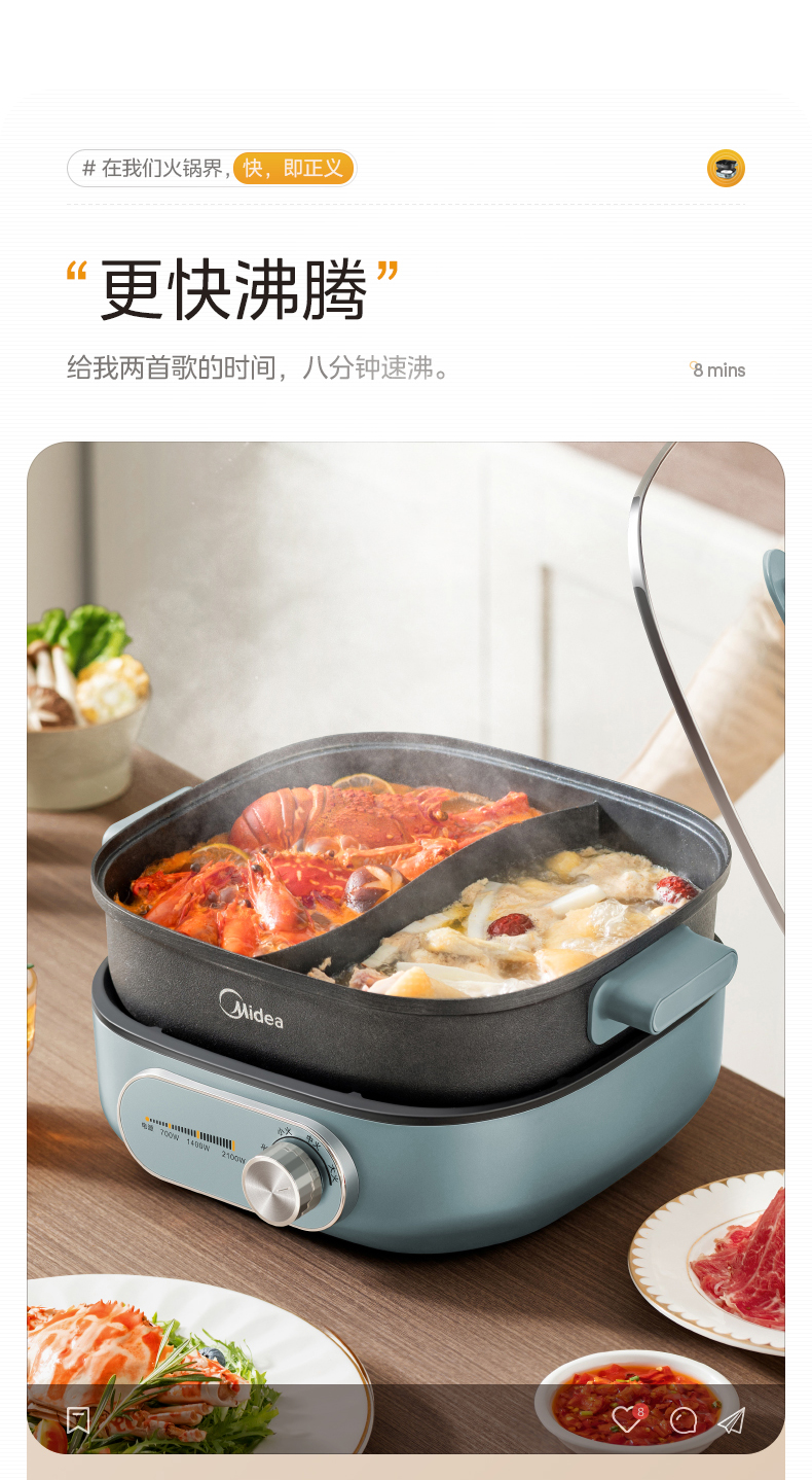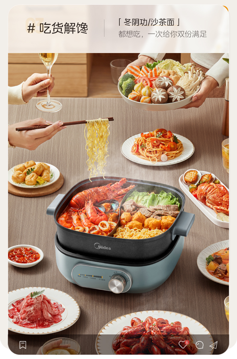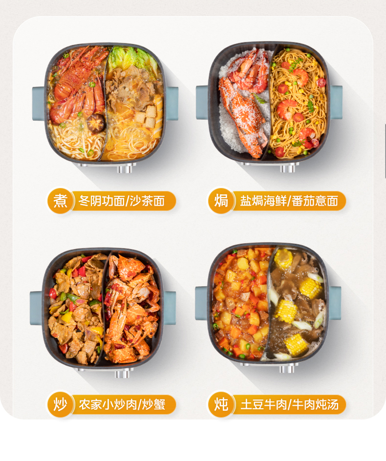 鸳鸯锅体设计,支持双味同煮,适配不同口味偏好