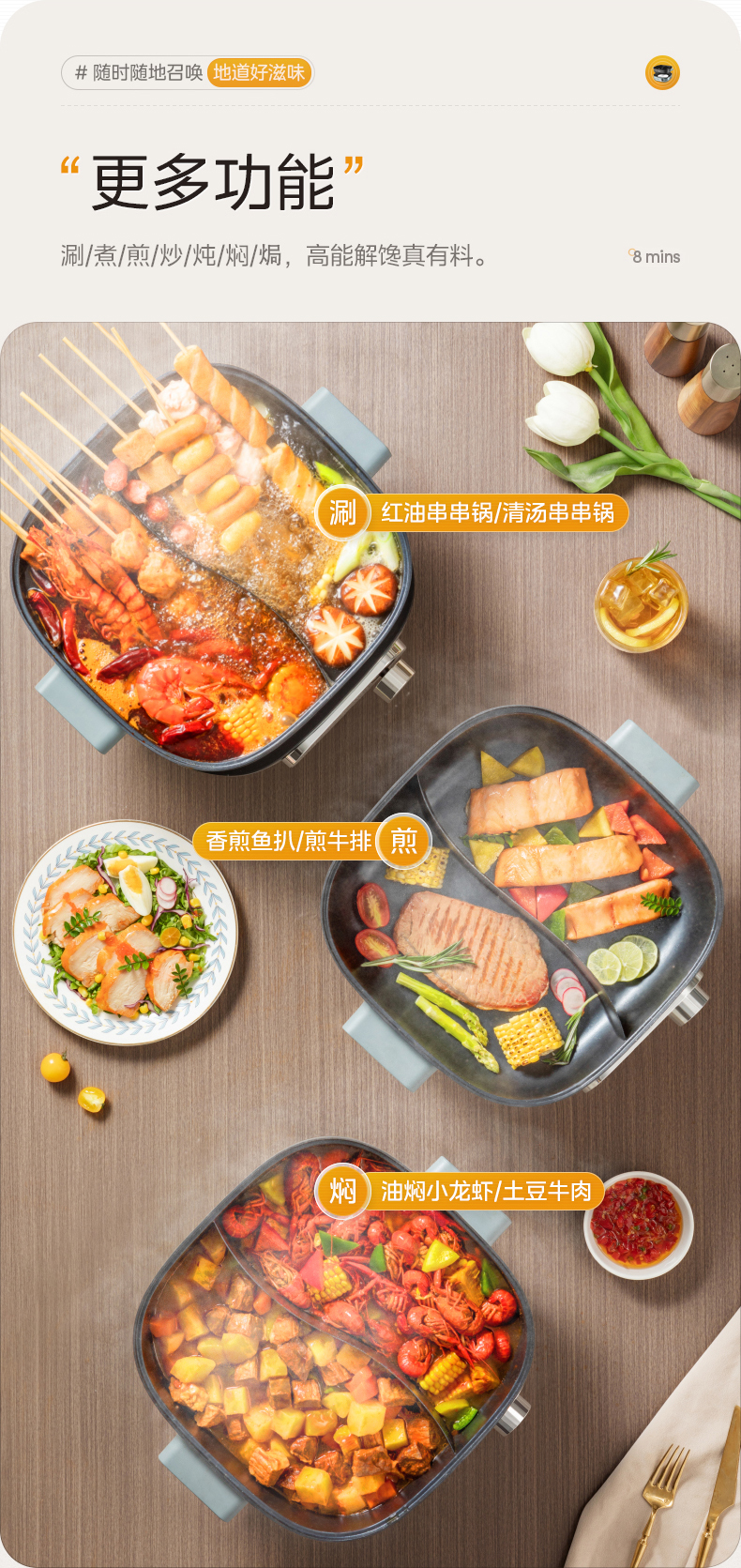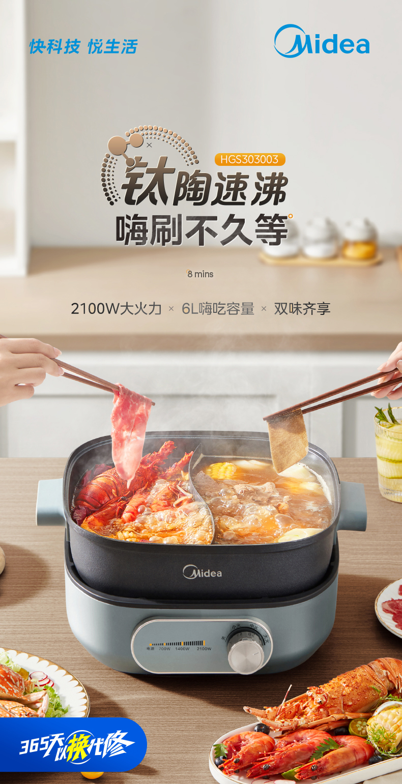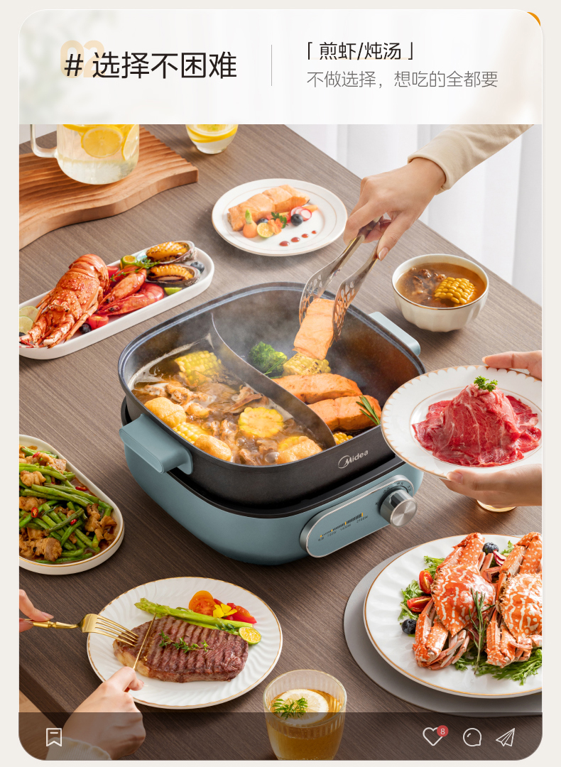 鸳鸯锅体设计,支持双味同煮,适配不同口味偏好