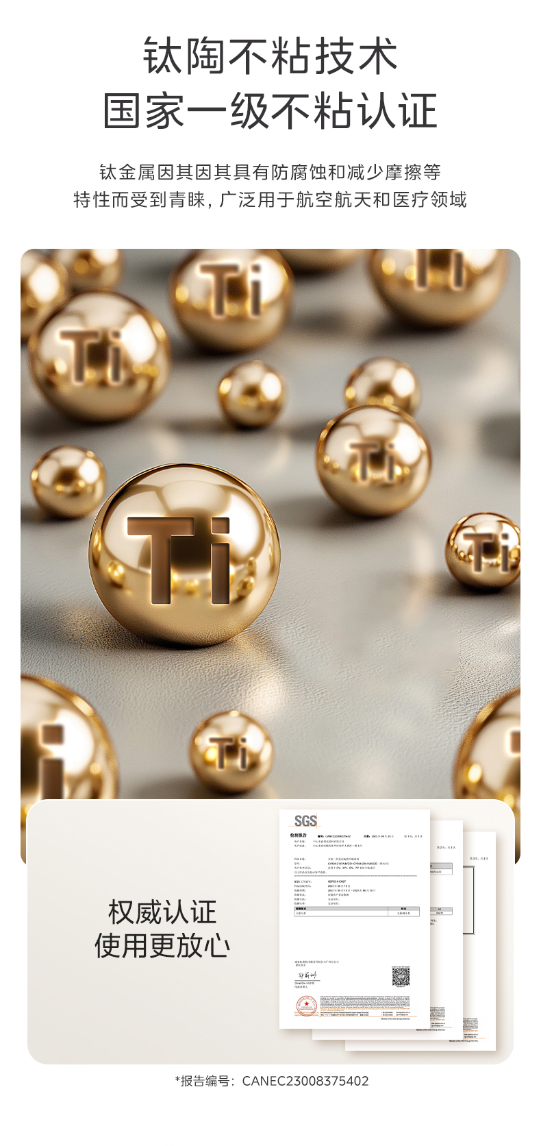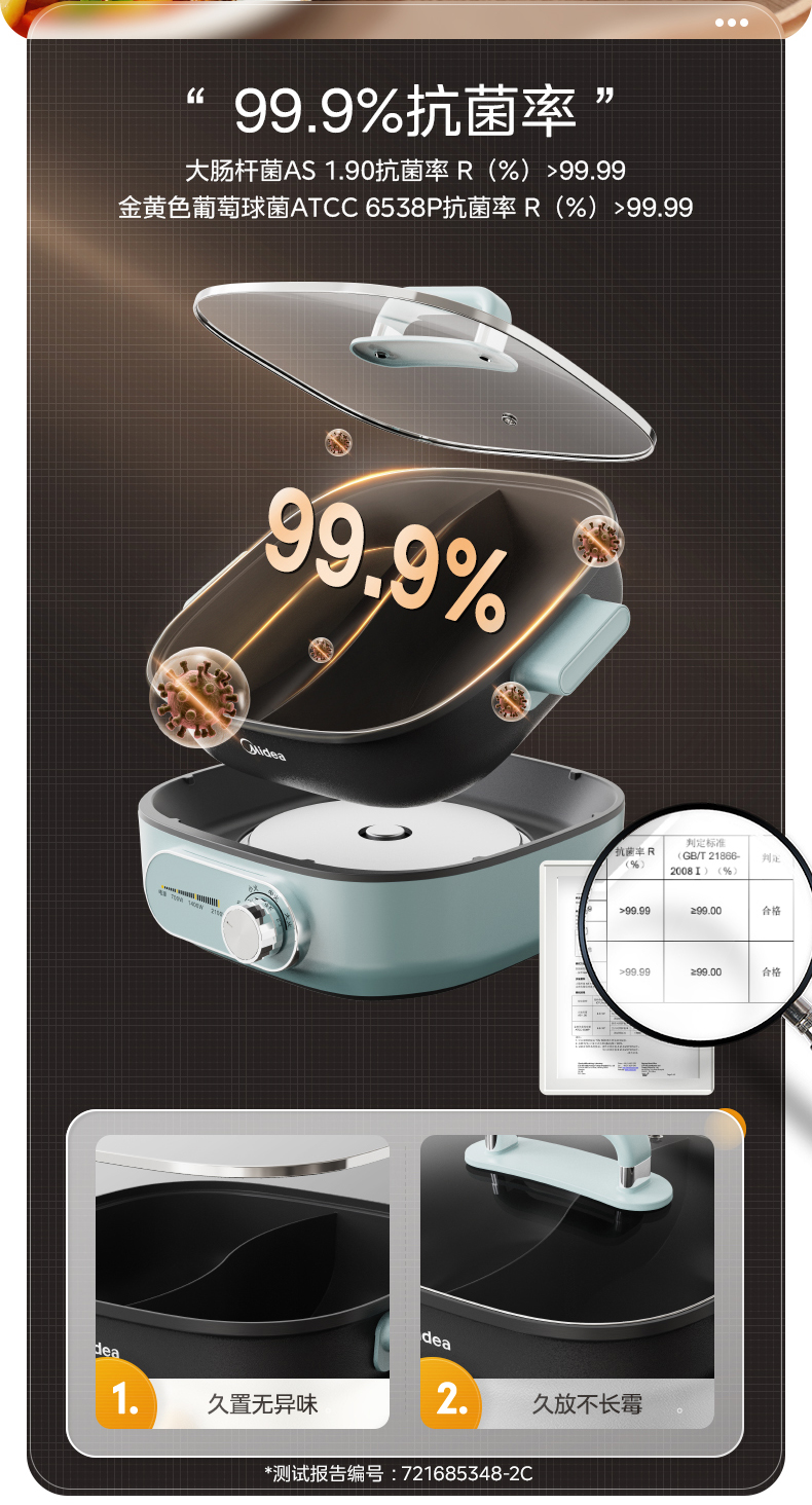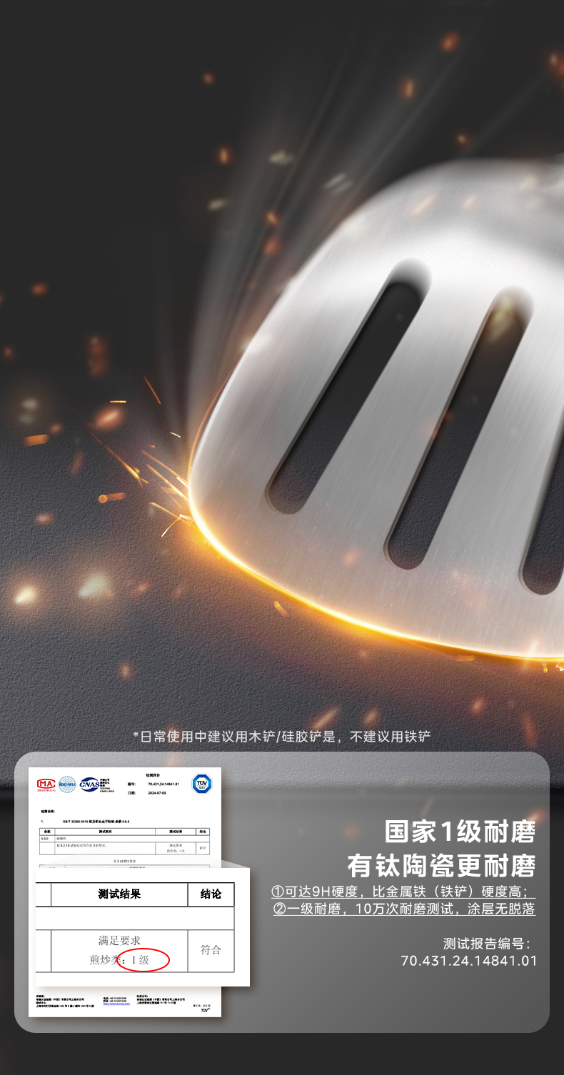钛陶不粘技术,国家一级不粘认证,0氟健康材质,大肠杆菌、金黄色葡萄球菌抗菌率达99.9%,抗菌不留异味