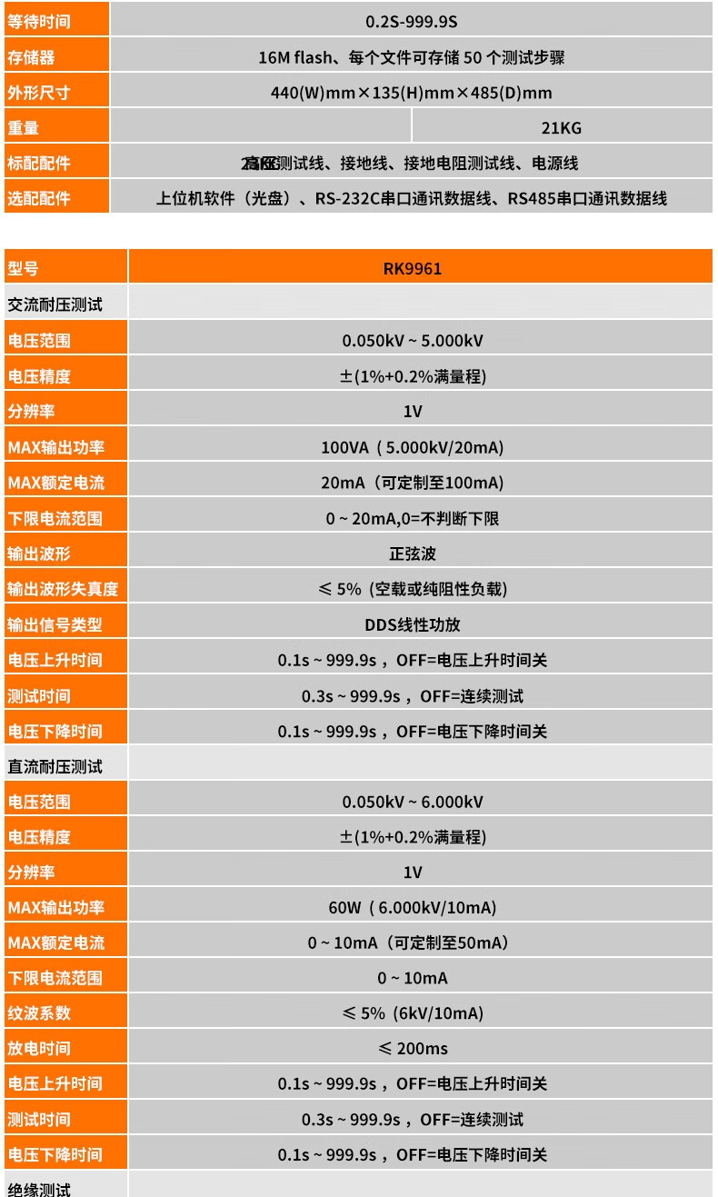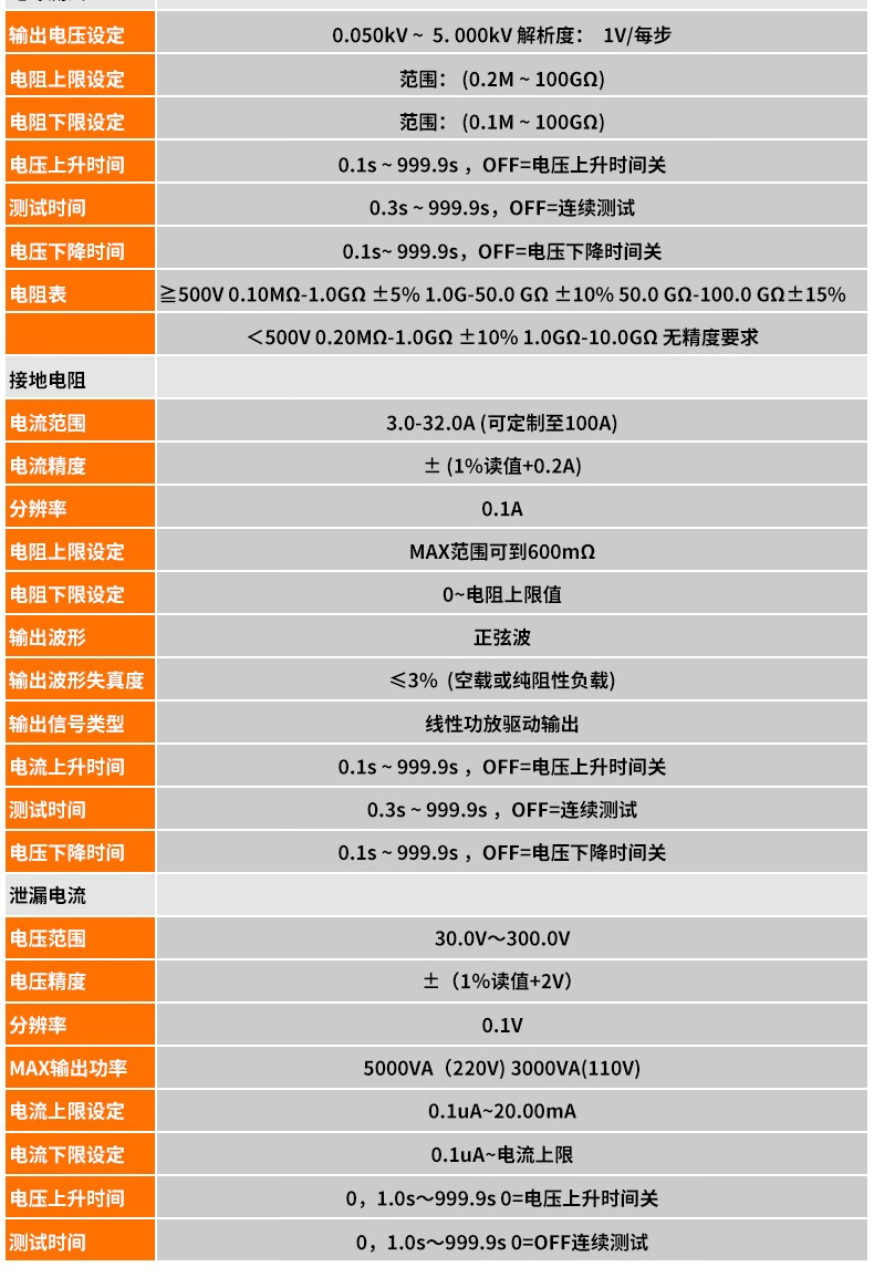 耐压测试输出电压范围:AC 0.050-5.000KV、DC 0.050-6.000KV,测试精度±(2.0%设定+2V);绝缘测试输出电压DC 0.100-1.000KV,测试电阻范围0.1MΩ-10GΩ