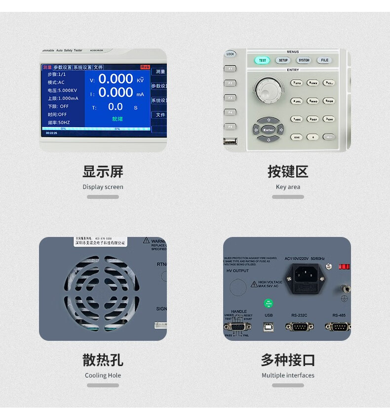 具备耐压(AC/DC)、绝缘电阻、接地电阻等多项目综合测试能力,满足多场景安规检测需求
