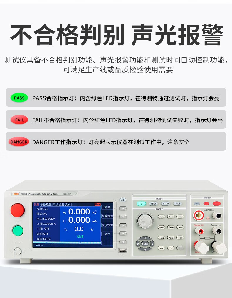 配备不合格判别、声光报警功能(PASS/FAIL/DANGER指示灯)及测试时间自动控制,适配生产线或品质检验场景