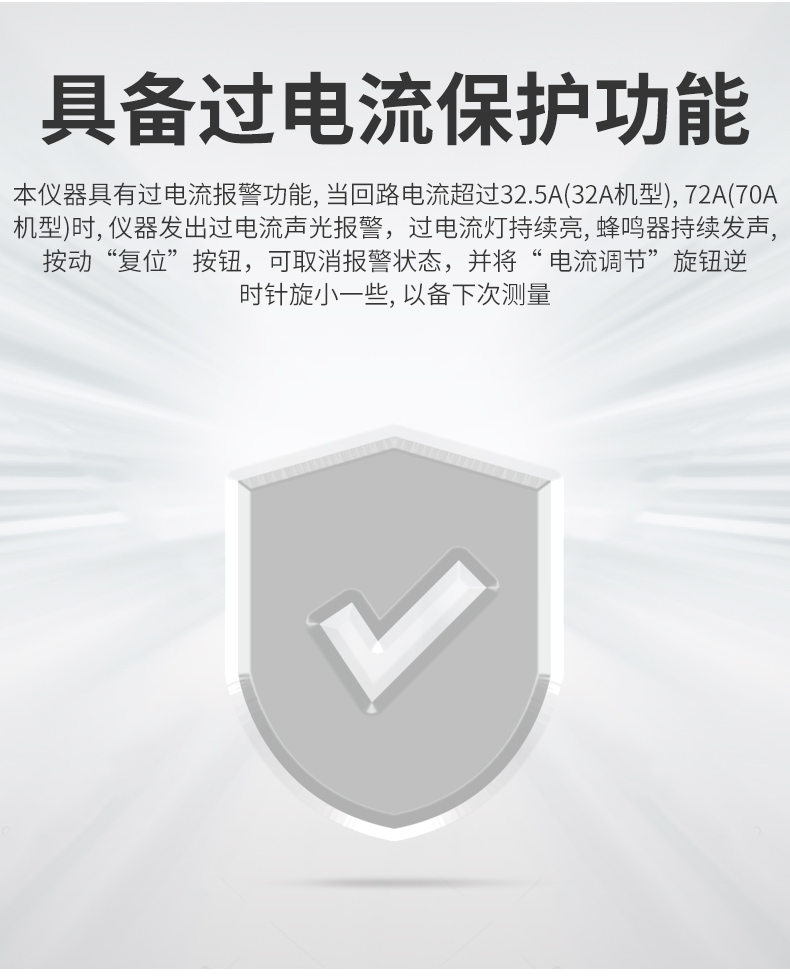 安全保护功能:具备过流保护,当回路电流超过32.5A时,仪器发出声光报警,需按复位按钮并调小电流调节旋钮后重新使用