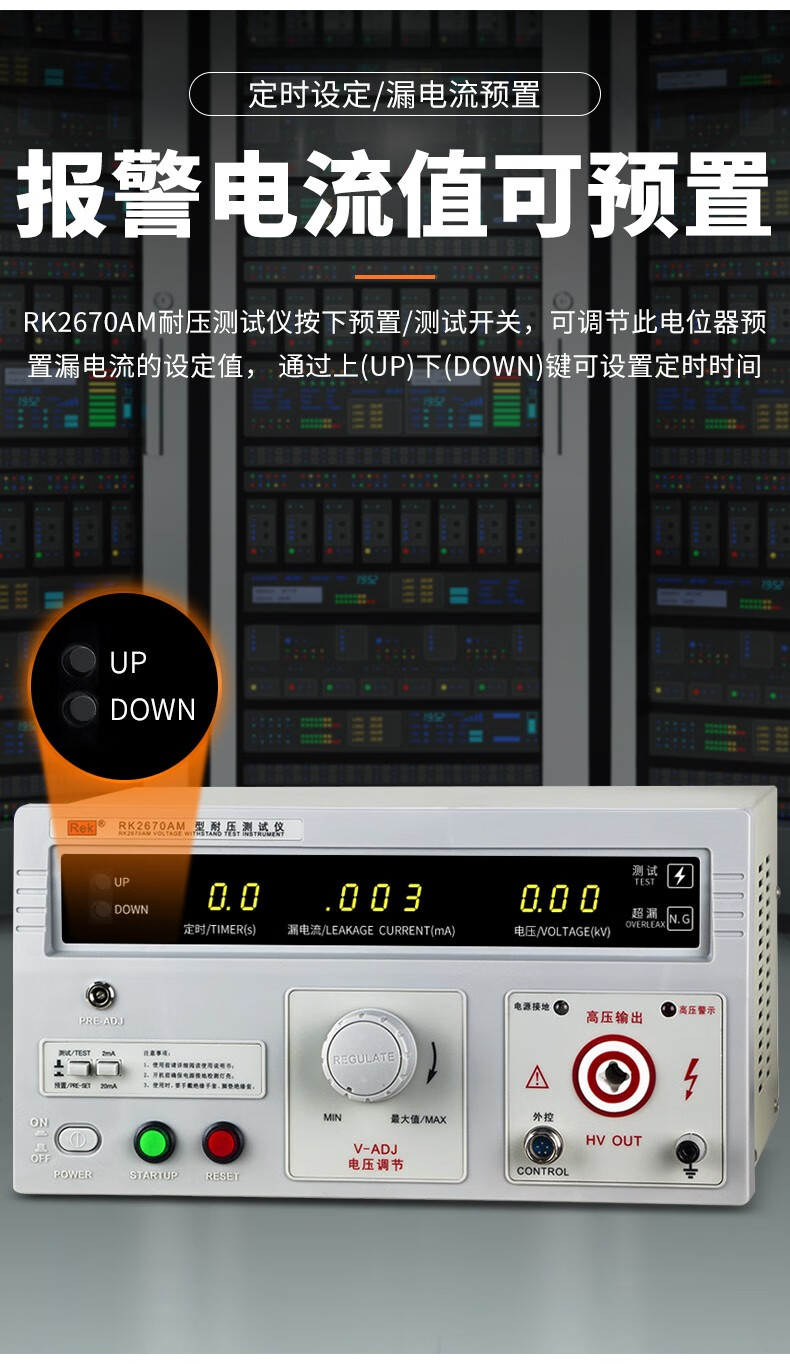 报警电流与定时预置:支持漏电流报警值预置,定时时间可通过UP/DOWN键设置(0.0s~999s,0s为连续测试)