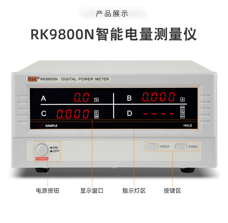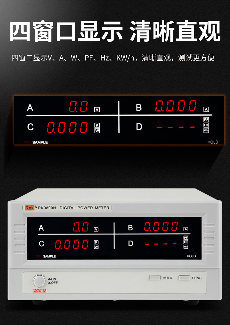 四窗口数字显示,可同时呈现电压(V)、电流(A)、功率(W)、功率因数(PF)、频率(Hz)、电能(KW/h)等参数,清晰直观