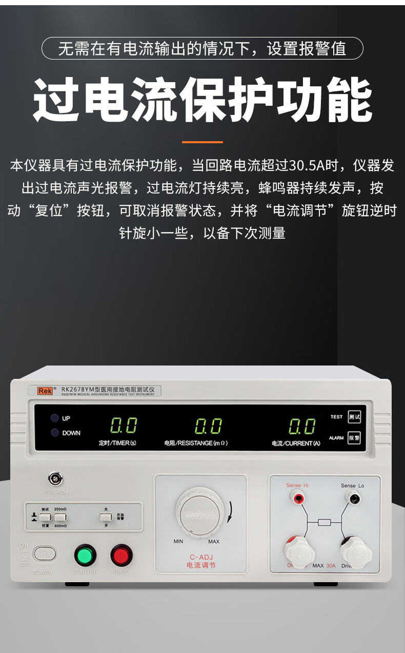 发生过电流报警后,需先按复位按钮,再将电流调节旋钮逆时针旋小,方可进行下次测试