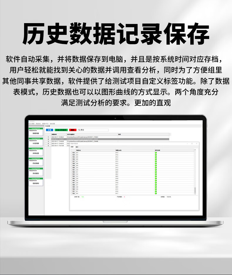 具备开路报警功能,支持大容量数据存储,可通过多种接口(PLC、RS232C、RS485、USB device、USB Host)与计算机或PLC组成综合测试系统