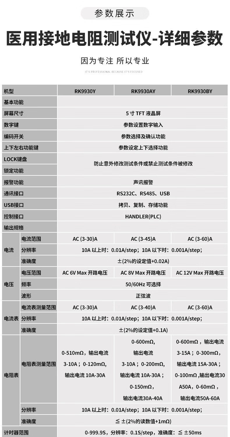 测试时间范围0-999.9S,0表示连续测试,判定值电阻上限范围0-600mΩ,分辨率1mΩ