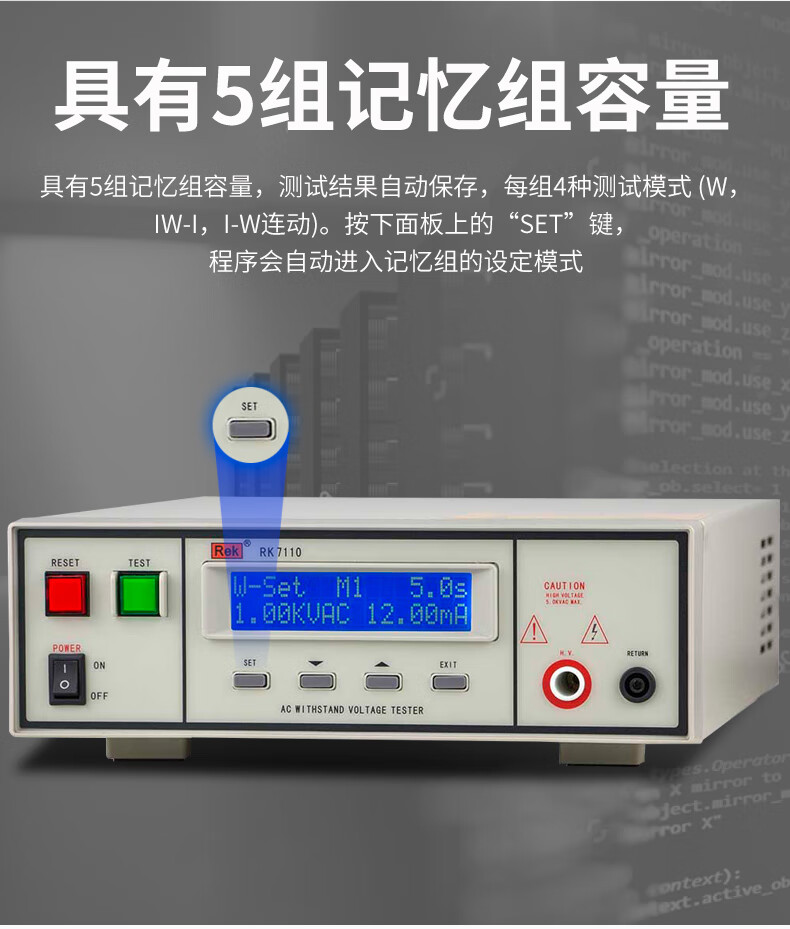 智能存储:内置5组记忆组容量,每组支持4种测试模式(W、IW-I、I-W联动等),可快速调用预设参数,提升测试效率