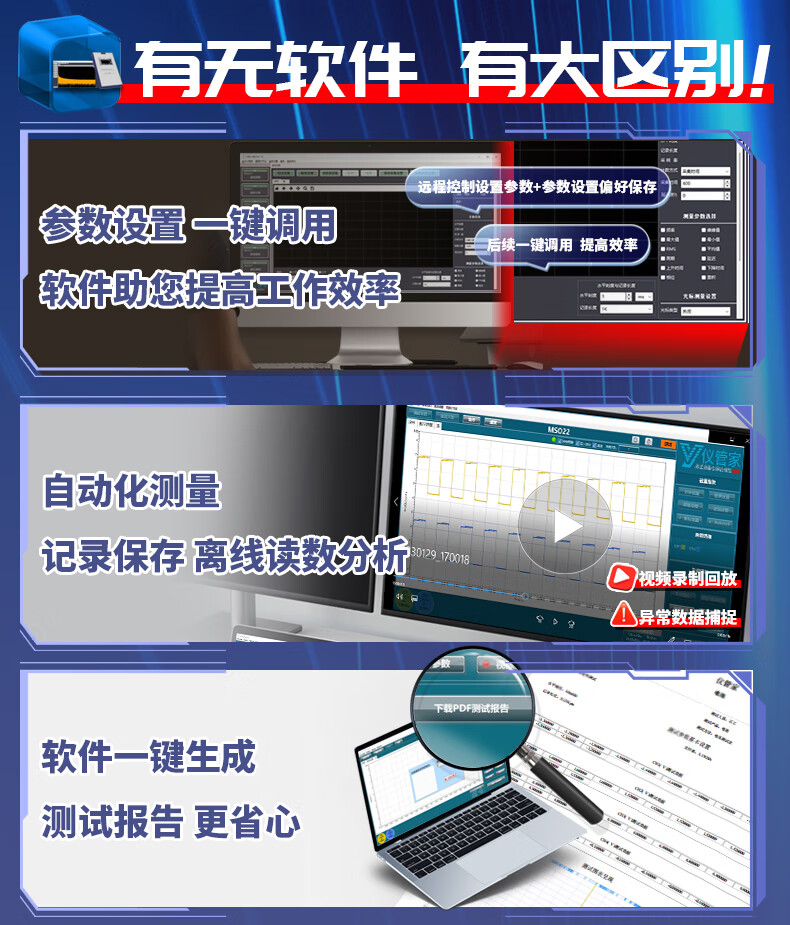 软件兼容:支持配套数据采集分析软件,实现参数一键调用、自动化测量、数据记录、报告生成等功能,提升效率