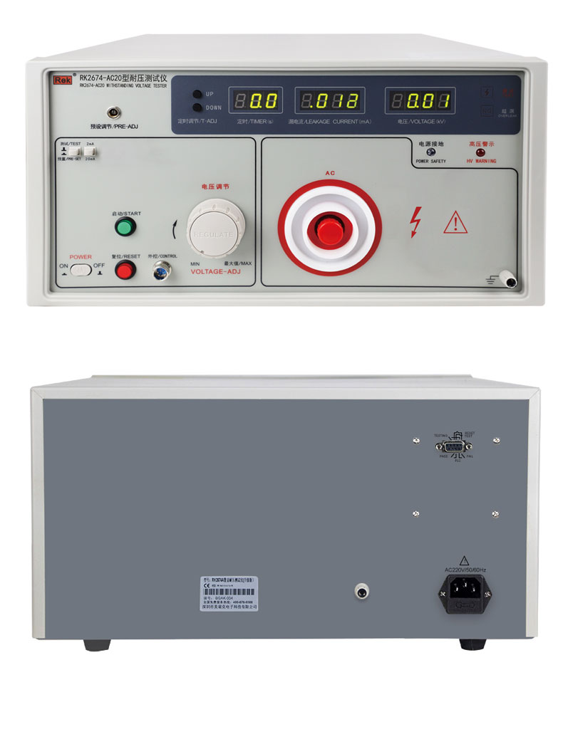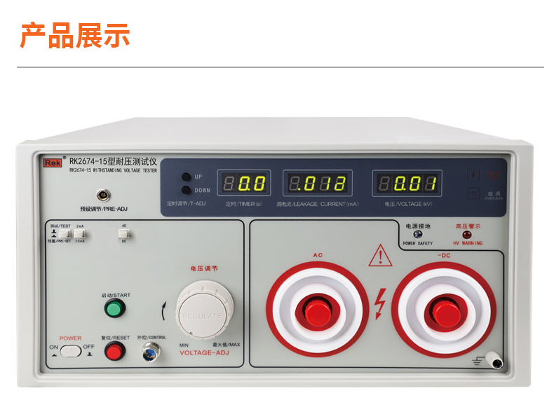 AC输出电压范围0-15kV,测试电流0-2/20mA;DC输出电压范围0-15kV,测试电流0-2/20mA