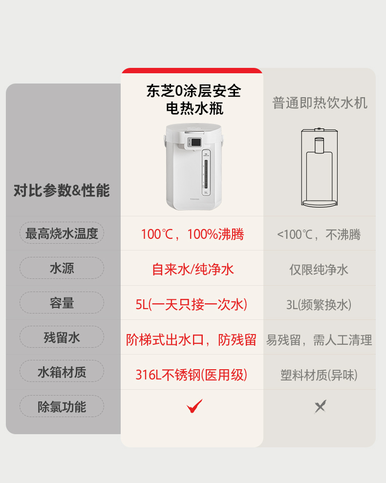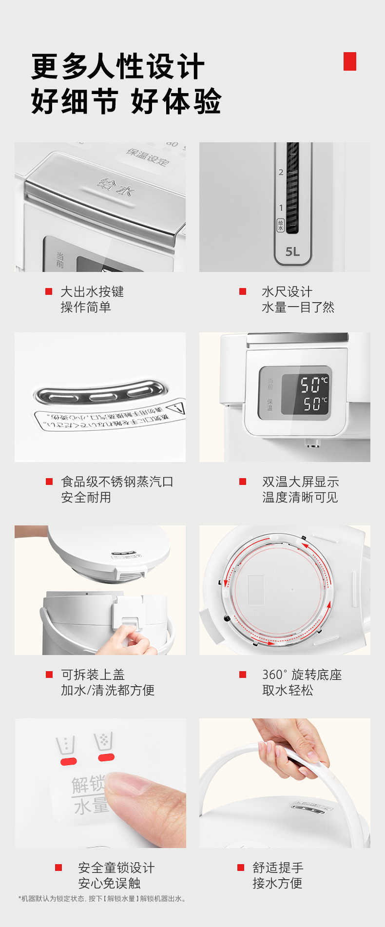 人性设计:大出水键、水尺显示、双温大屏、可拆上盖、360°旋转底座、舒适提手等细节设计