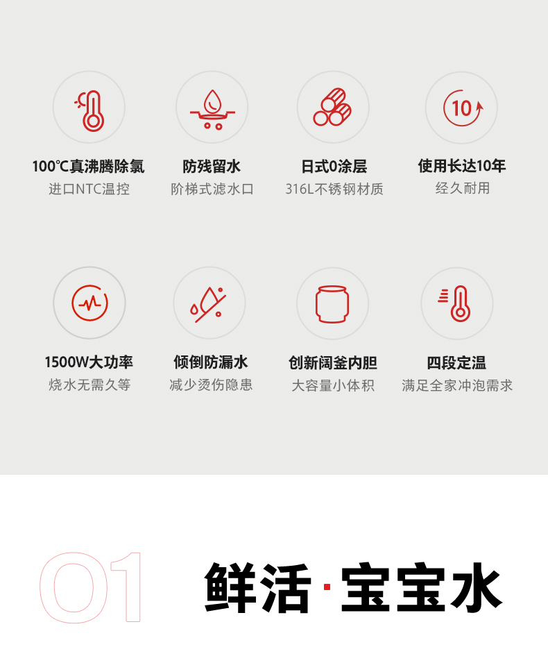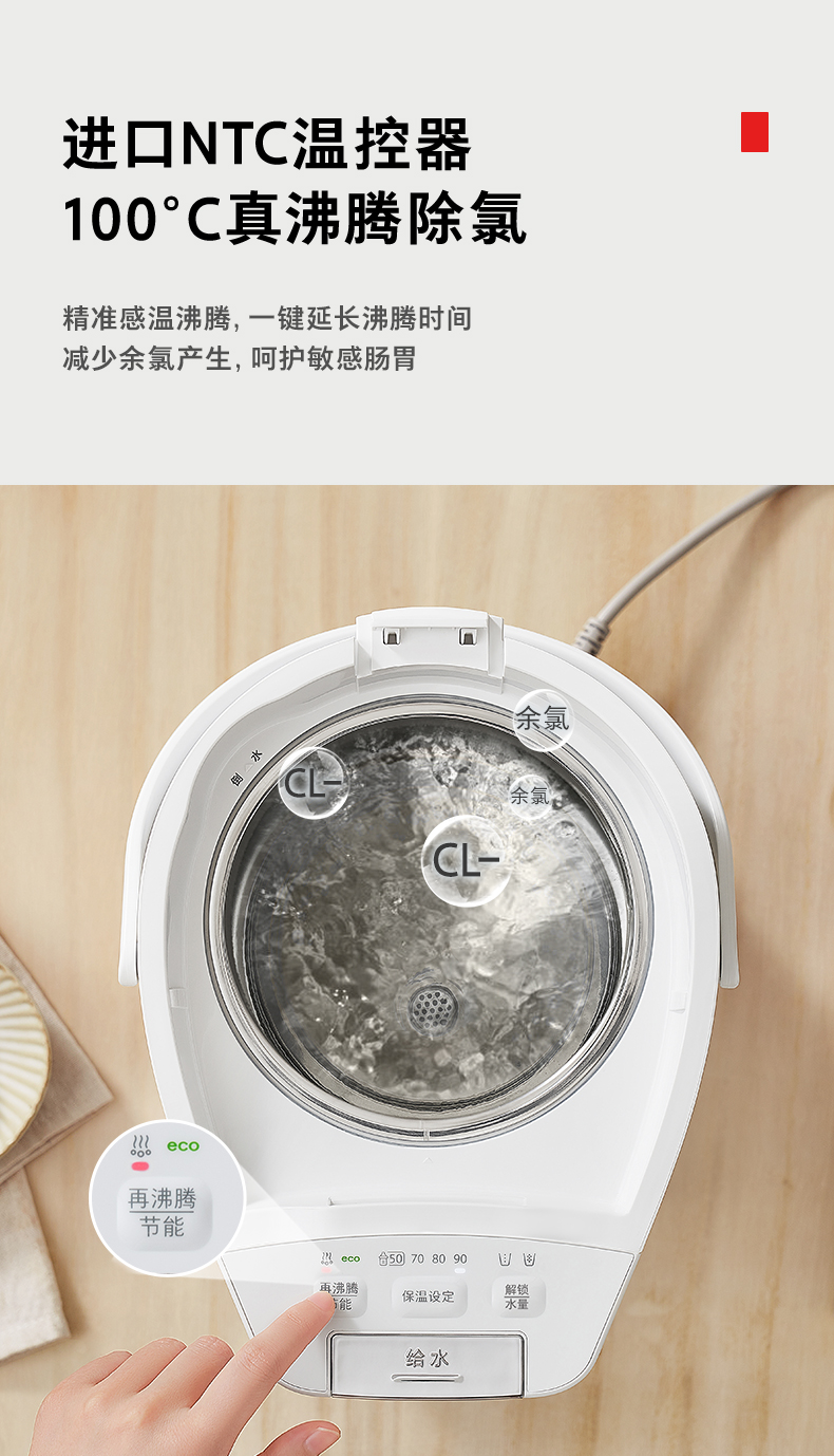 加热性能:1500W大功率速热,25分钟烧开5L水;进口NTC温控器,支持100℃真沸腾除氯,减少余氯刺激