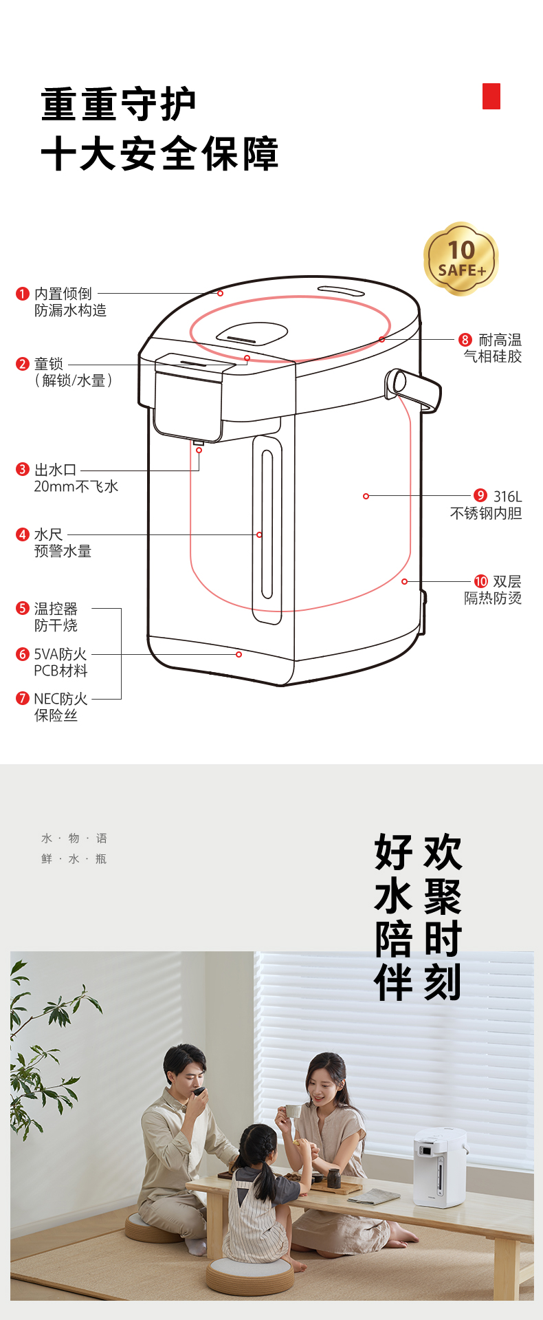 安全设计:专利倾倒防漏水(日本发明专利JP2017563224);十大安全保障(防干烧、童锁、双层隔热等)