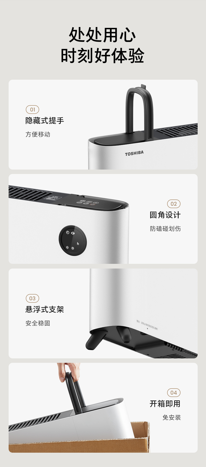 隐藏式提手设计,方便移动;圆角边缘防磕碰划伤;悬浮式支架安全稳固