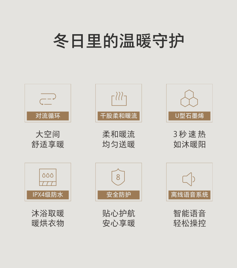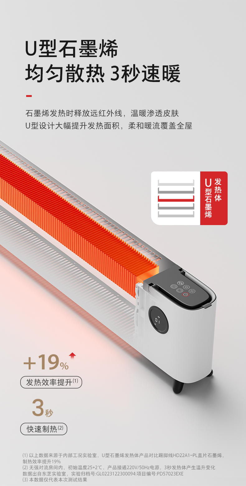 采用U型石墨烯发热体,发热效率提升19%,3秒速热,释放远红外线,温暖渗透皮肤
