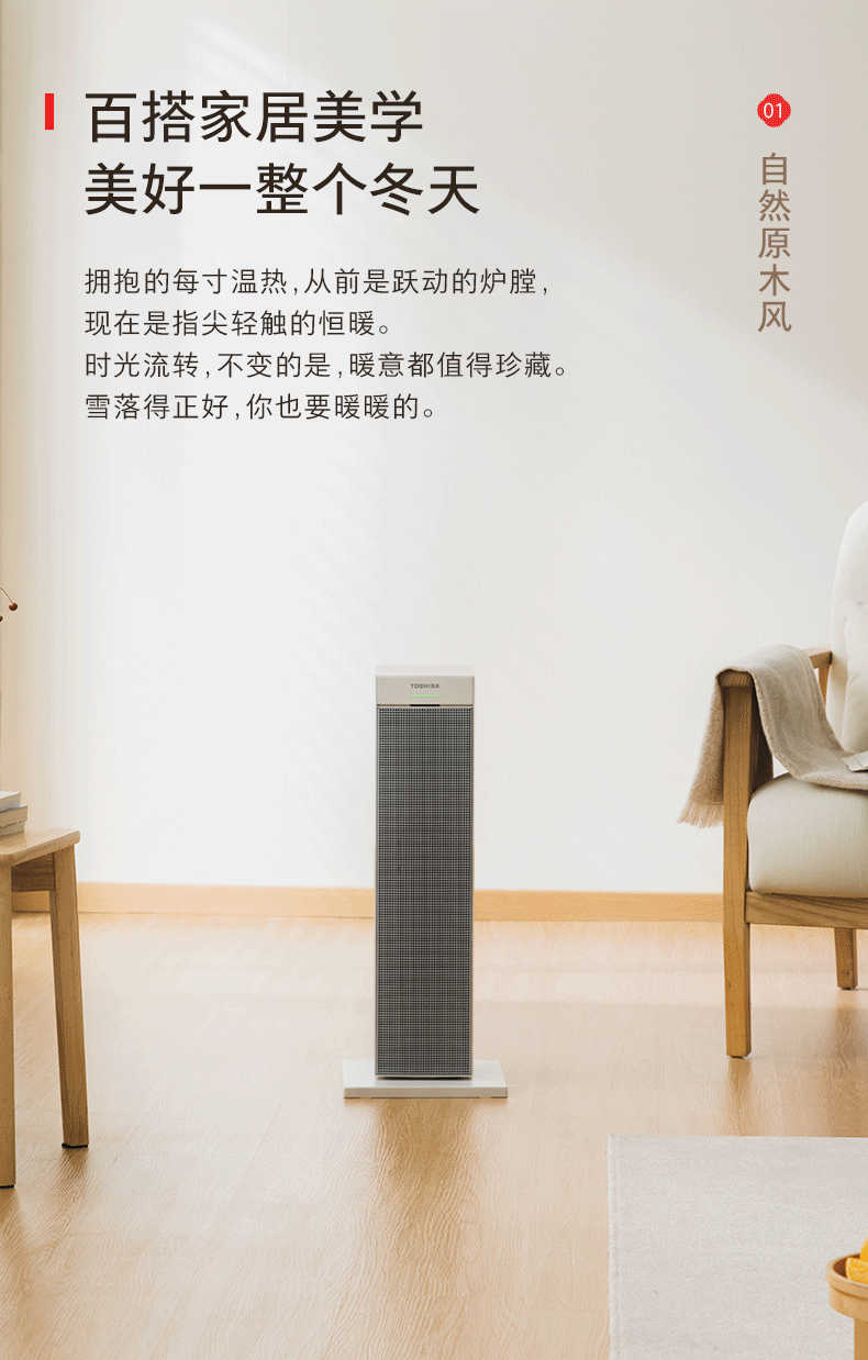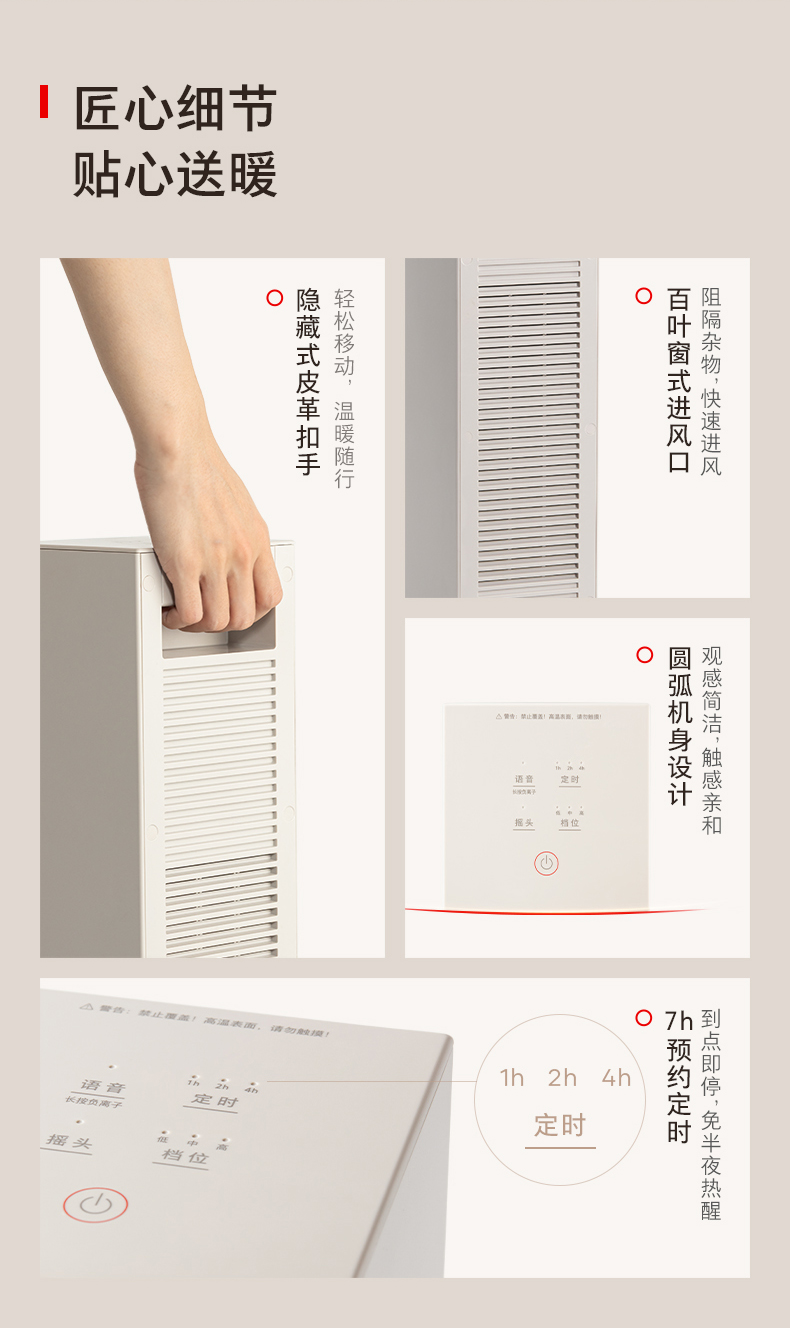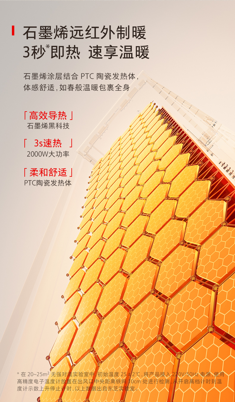 高效制暖:石墨烯远红外涂层结合PTC陶瓷发热体,3秒即热,2000W大功率,适配20-25㎡空间
