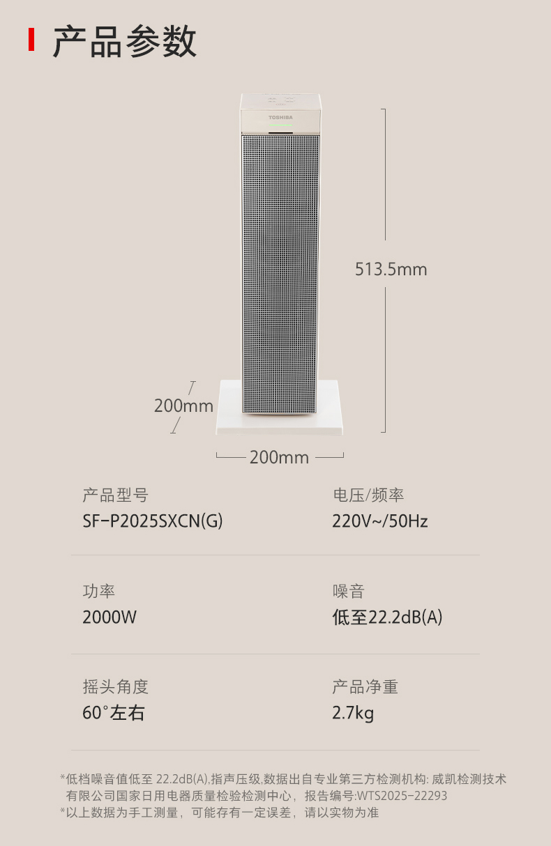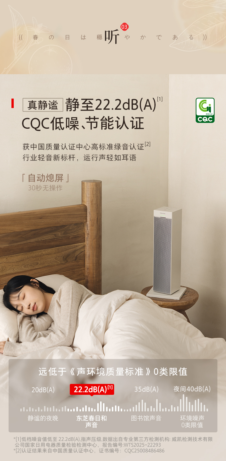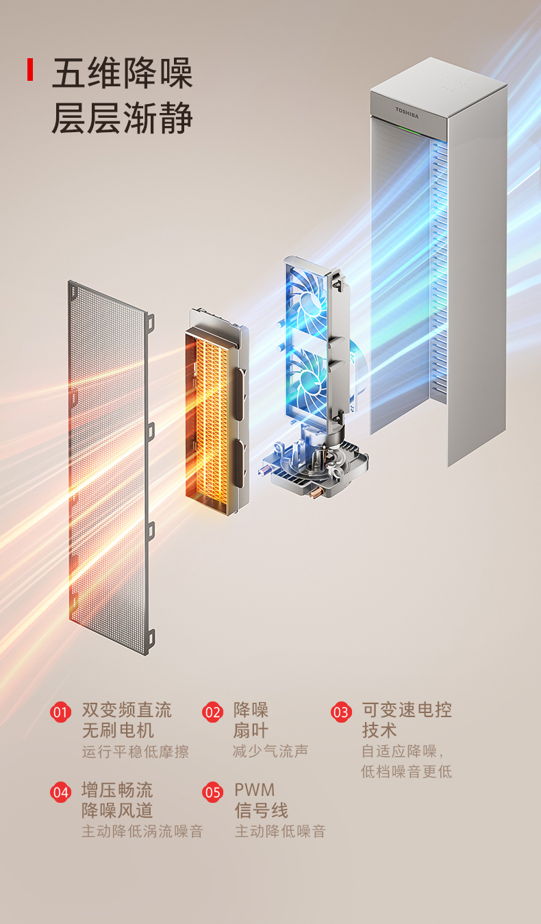 低噪音运行:五维降噪技术(双变频直流无刷电机、降噪扇叶等),低档噪音低至22.2dB(A),获CQC低噪认证,不打扰睡眠与办公