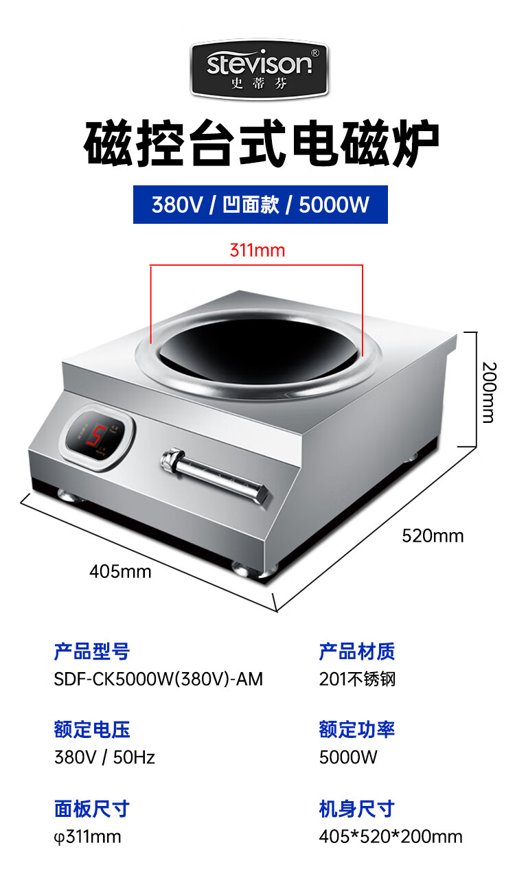 Stevison(史蒂芬) SDF-CK5000W(380V)-AM 台式凹面电磁炉(含炒锅) 380V 5000W 磁控款 不锈钢