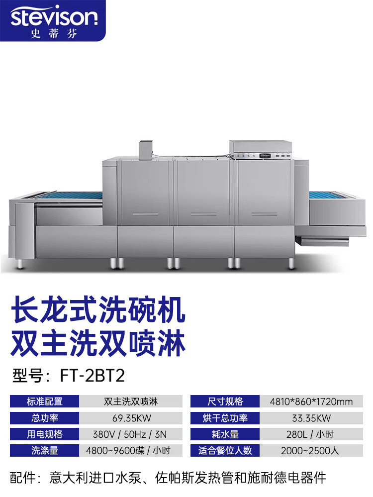 Stevison(史蒂芬) FT-2BT2 长龙式洗碗机 商用洗碗机大型酒店食堂餐厅饭店大容量刷碗机厨房设备 双缸双喷 380V 不锈钢
