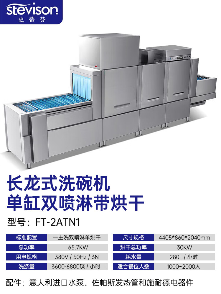 Stevison(史蒂芬) FT-2AT1 长龙式洗碗机 商用洗碗机 大型酒店食堂餐厅饭店大容量刷碗机厨房设备 单缸双喷 380V 不锈钢