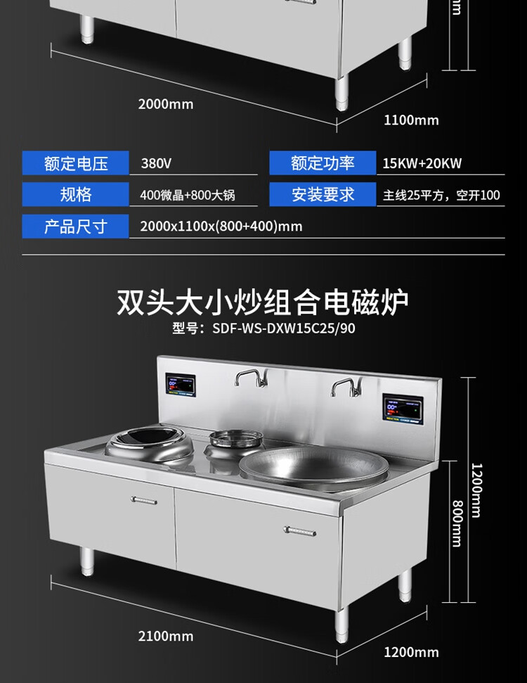 Stevison(史蒂芬) SDF-WS-DXW15C30/100 电磁款大小炒炉 电压:380V 功率:15KW+30KW 材质:201不锈钢