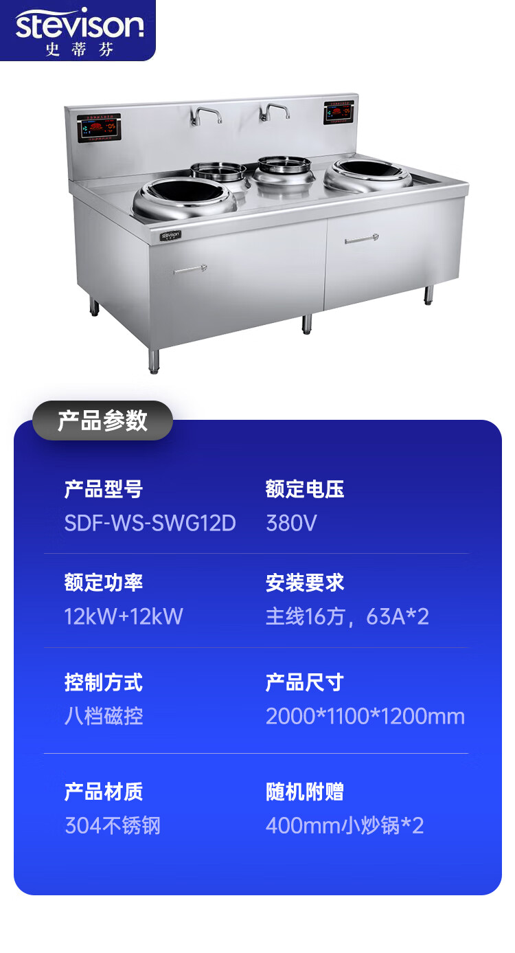 Stevison(史蒂芬) SDF-WS-SWG12D 双头双尾小炒炉 电压380V 功率12KW+12KW 400微晶板 配500mm小炒锅*2 304不锈钢