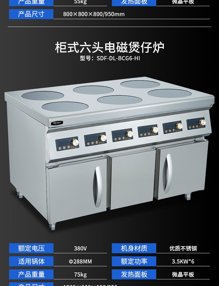 Stevison(史蒂芬) SDF-DL-BC6-HI 电磁款六眼煲仔炉 电压:380V 功率:3.5kW*6 不锈钢