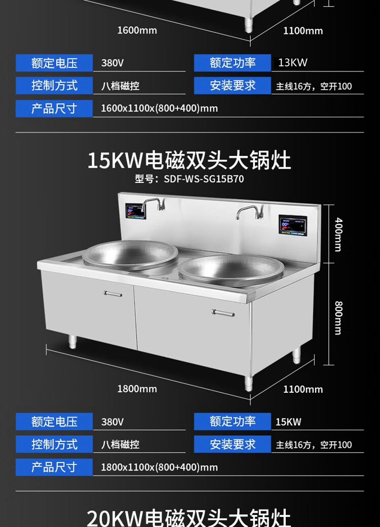 Stevison(史蒂芬) SDF-WS-SG15B70 电磁款双头大锅灶 电压:380V 功率:15KW*2 材质:201不锈钢