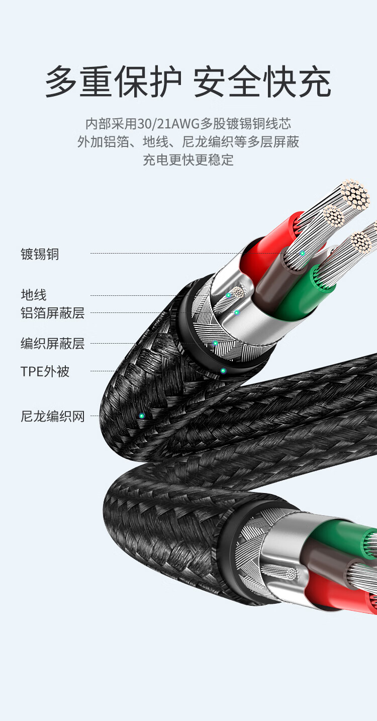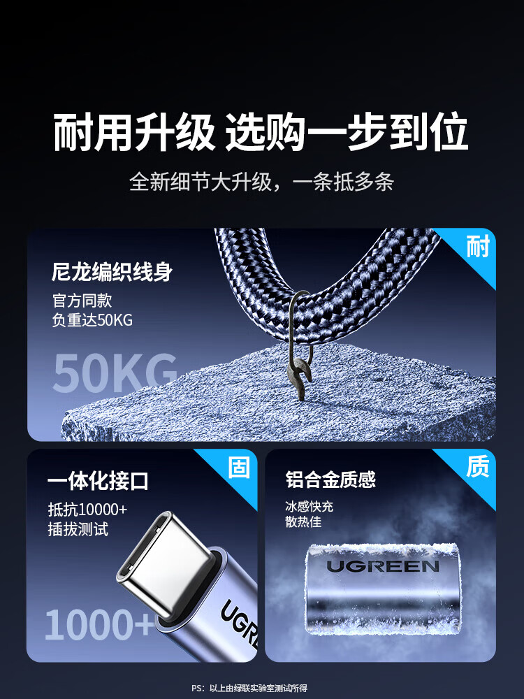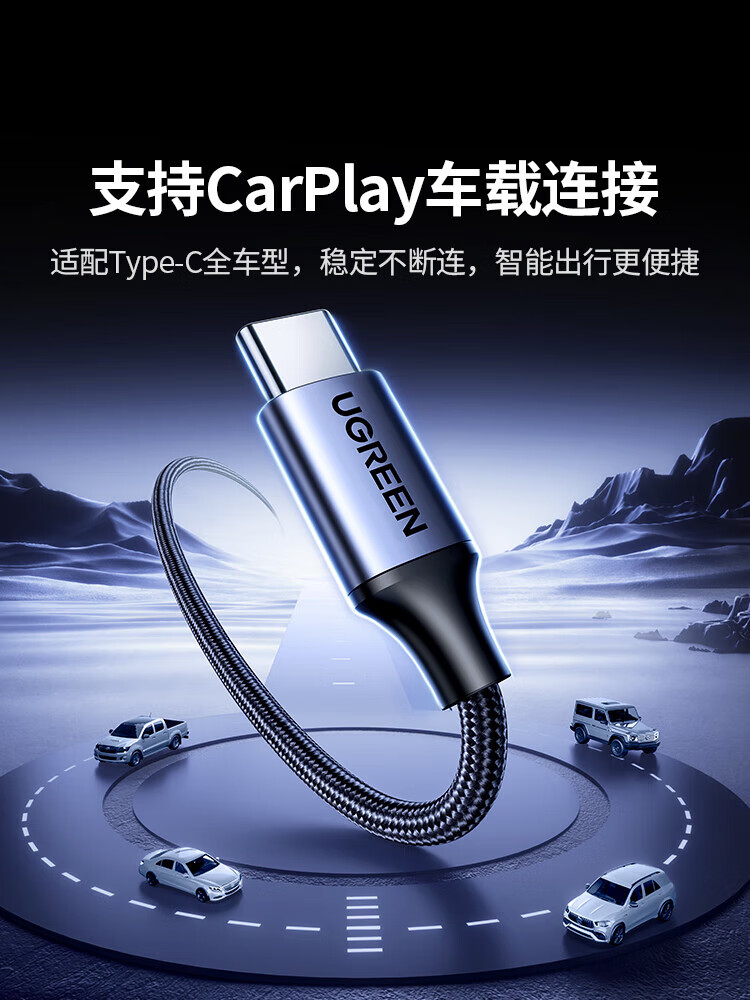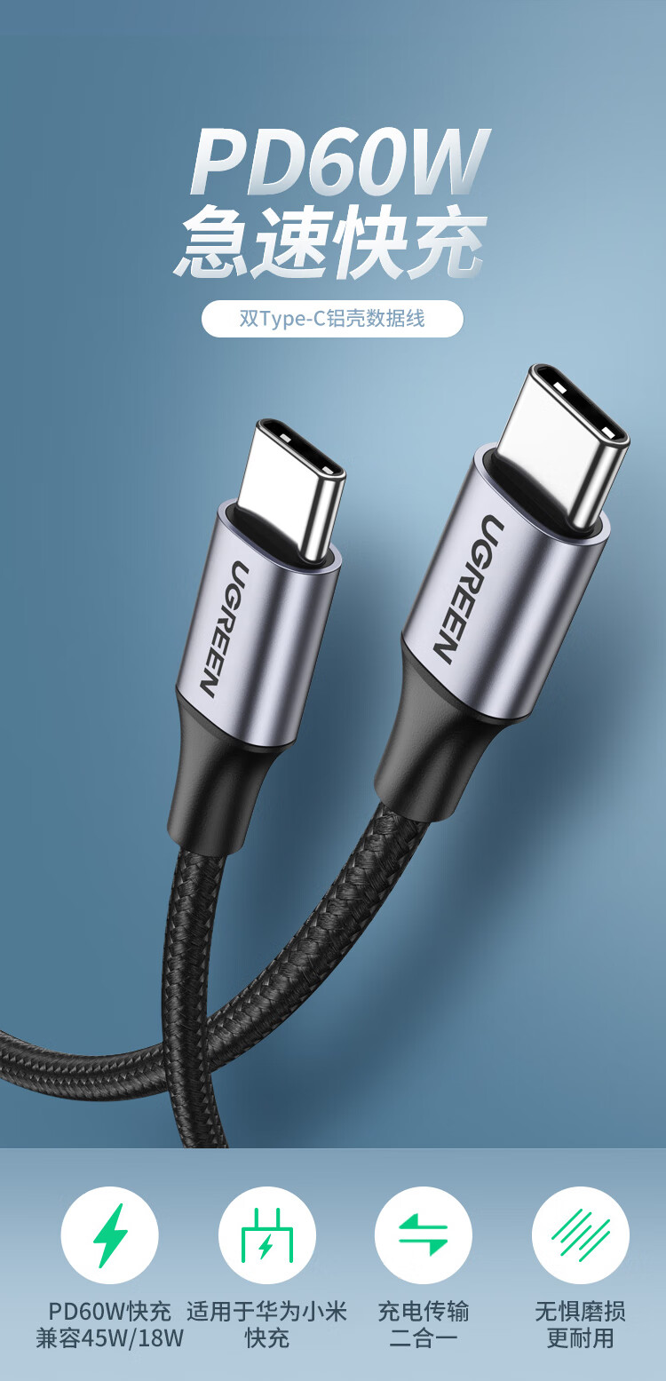 绿联(UGREEN)Type-C数据线 快充pd60W 1.5米深空灰编织款 50151