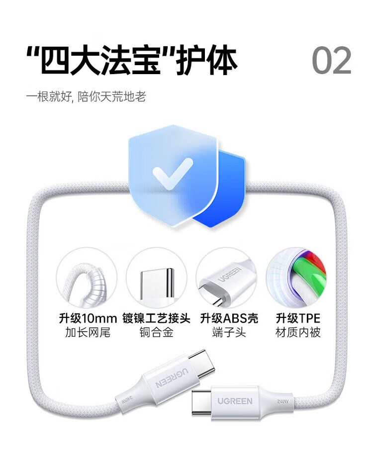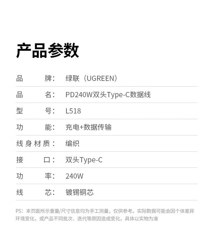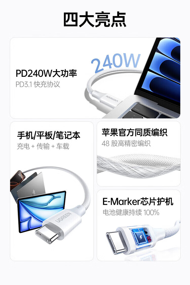 绿联(UGREEN)双头TypeC数据线PD240W快充 2米 55515