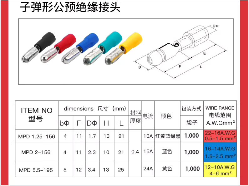 汇君子 弹头公母对接端子(黄色)zdt-Y-50 0.5-1.5平方 黄色