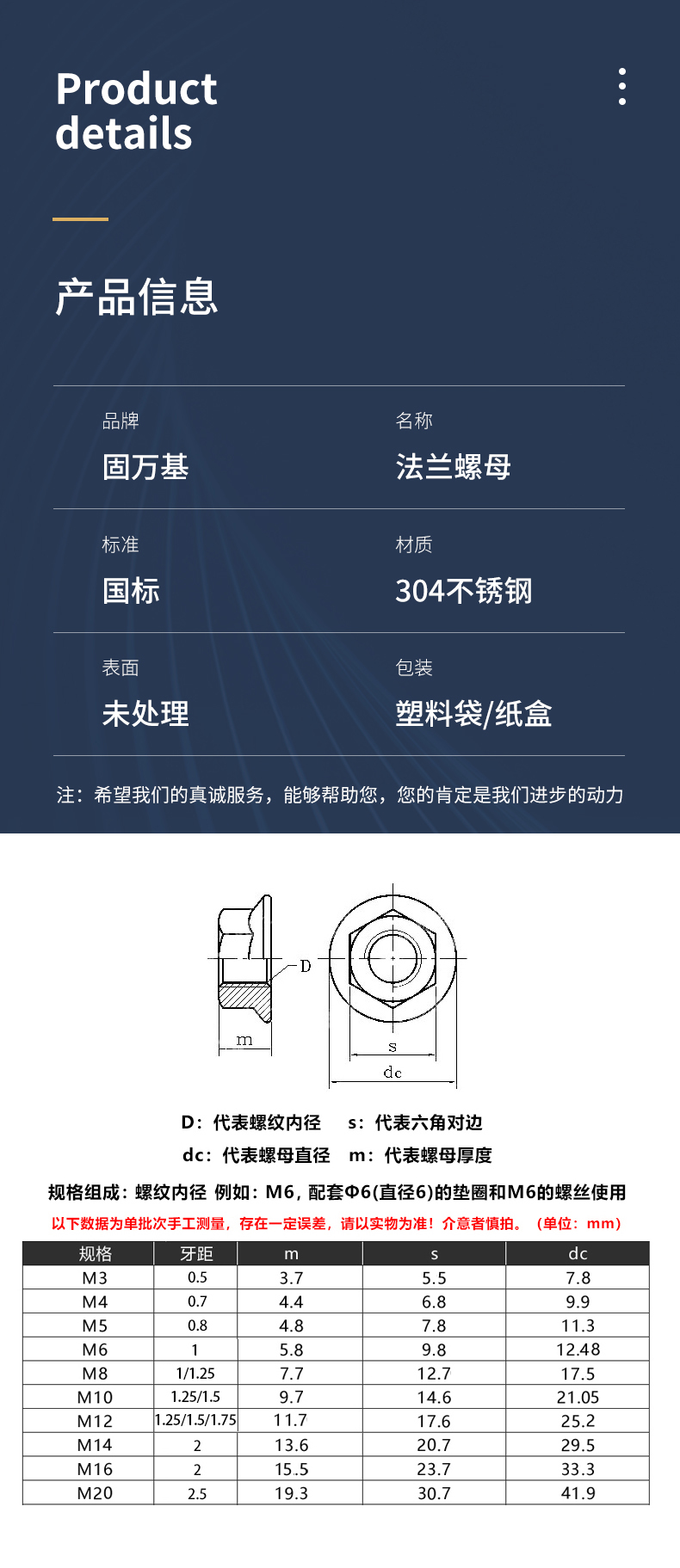 GUWANJI(固万基) 304不锈钢法兰螺母镀锌六角防松螺丝带垫防滑螺帽 M20