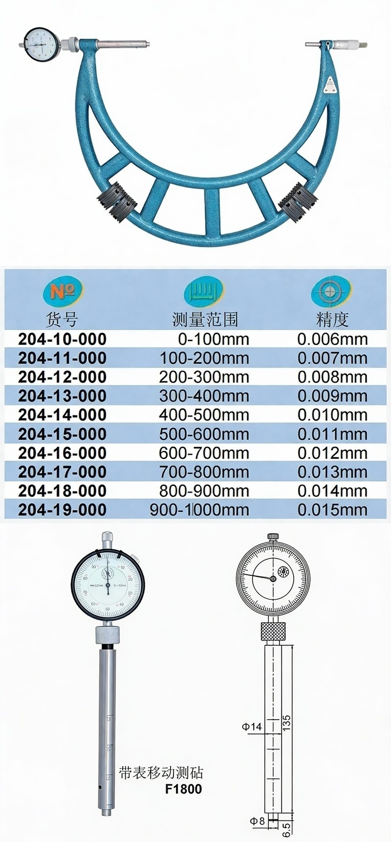 XIBEI(西北) 青量带表移动测砧外径,204-12-000 200-300*0.01mm、最大测力10N、量表行程5mm 售卖规格:1把